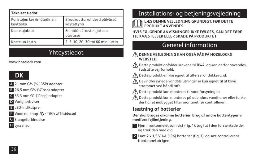 BRUGSANVISNING SENSOR, 1 VOIES - 2212 HOZELOCK