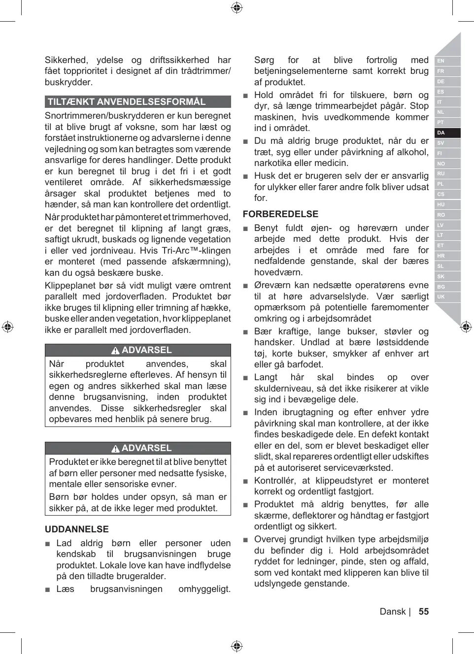 TILTÆNKT ANVENDELSESFORMAL Snortrimmeren/buskrydderen er kun beregnet til at blive brugt af voksne, som har læst og forstäet instruktionerne og advarslerne i denne vejledning og som kan betragtes som værende ansvarlige for deres handlinger. Dette produkt er kun beregnet til brug i det fri i et godt ventileret omrâde. Af sikkerhedsmæssige ärsager skal produktet betjenes med to hænder, sà man kan kontrollere det ordentligt. När produktethar pämonteretettrimmerhoved, er det beregnet til klipning af langt græs, saftigt ukrudt, buskads og lignende vegetation i eller ved jordniveau. Hvis Tri-Arc""-klingen er monteret (med passende afskærmning), kan du ogsà beskære buske.