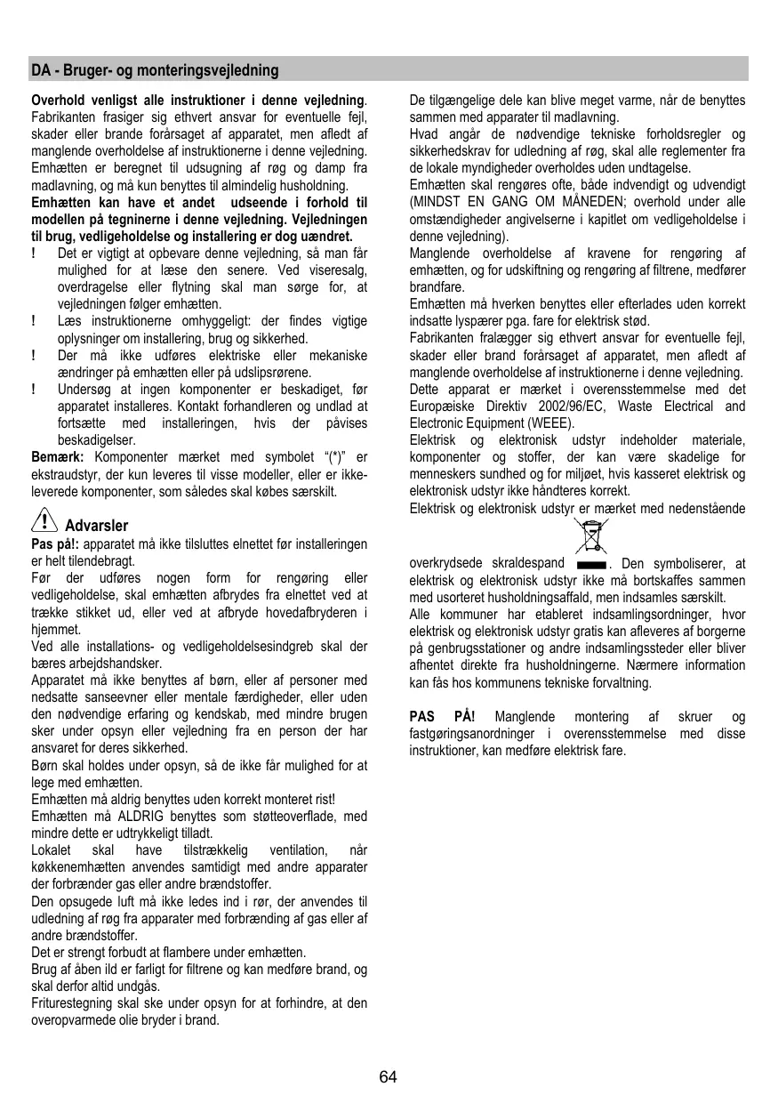 Lokaket skal have tistrækkelig ventilation, nèr kokkenemhæten anvendes samidigt med andre apparater der forbrænder gas eller andre brændstoffer.
