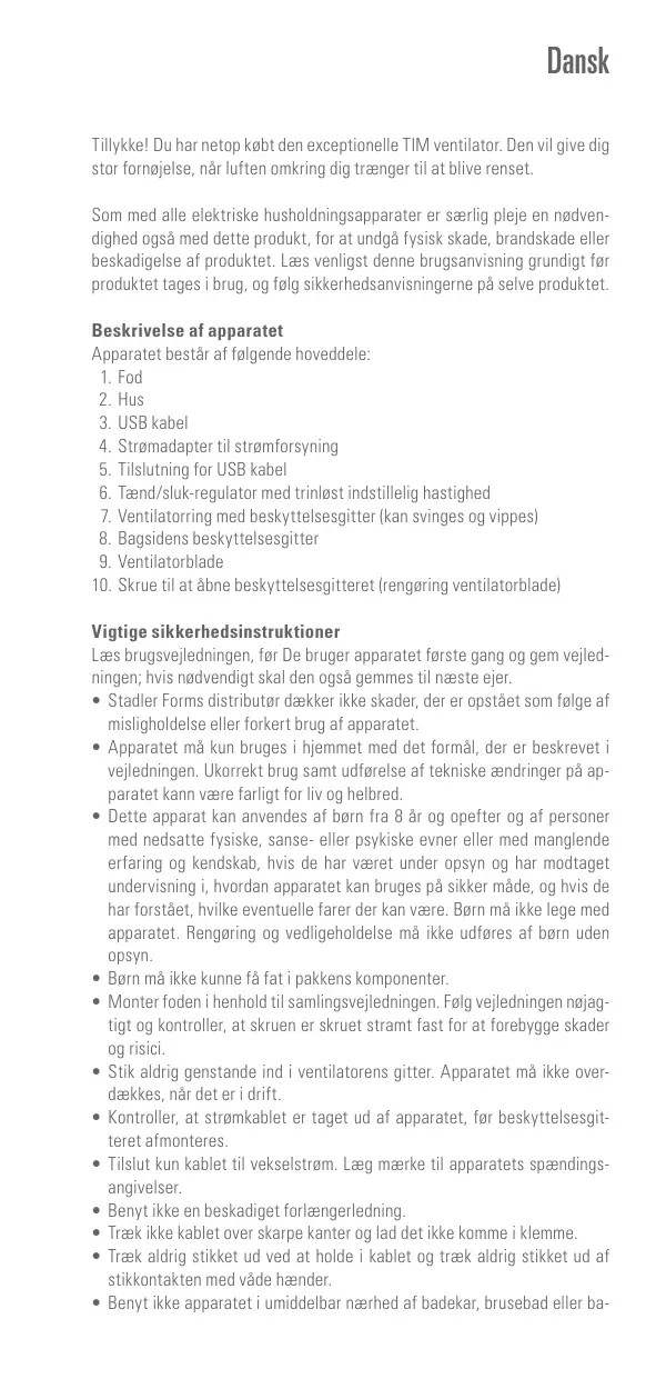 Vigtige sikkerhedsinstruktioner Læs brugsvelledningen, fr De bruger apparatet forste gang og gem velled- ningen: hvis nadvendigt skal den ogsä gemmes til næste ejer. + Stadler Forms distributer dækker ikke skader, der er opstäet som folge af misligholdelse eller forkert brug af apparatet + Apparatet mà kun bruges i hjemmet med det formäl, der er beskrevet i veiledningen. Ukorrekt brug samt udfarelse af tekniske ændringer pà ap- paratet kann være farligt for liv og helbred. Dette apparat kan anvendes af born fra 8 är og opefter og af personer med nedsatte fysiske, sanse- eller psykiske evner eller med manglende erfaring og kendskab, hvis de har været under apsyn og har modtaget undervisning i, hvordan apparatet kan bruges pä sikker mâde, ag hvis de har forstäet, hvilke eventuelle farer der kan være. Born md ikke lege med apparatet. Rengaring og vedligeholdelse mà ikke udfores af born uden opsyn Born mà ikke kunne f4 fat i pakkens komponenter. Monter foden i henhold til samlingsveledningen. Folg veiledningen nojag- tigt og kontroller, at skruen er skruet stramt fast for at forebygge skader og risici Stik aldrig genstande ind i ventilatorens gitter. Apparatet mà ikke over- dækkes, nâr det er drift Kontroller, at stramkablet er taget ud af apparatet, far beskyttelsesgit- teret afmonteres. Tilslut kun Kablet til vekselstrom. Læg marke til apparatets spændings- angivelser. Benytikke en beskadiget forlængerledning Træk ikke kablet over skarpe kanter ag lad det ikke komme i klemme: + Træk aldrig stikket ud ved at holde i kablet og træk aldrig stikket ud af stikkontakten med väde hænder. + Benyt ikke apparatet i umiddelbar nærhed af badekar, brusebad eller ba-