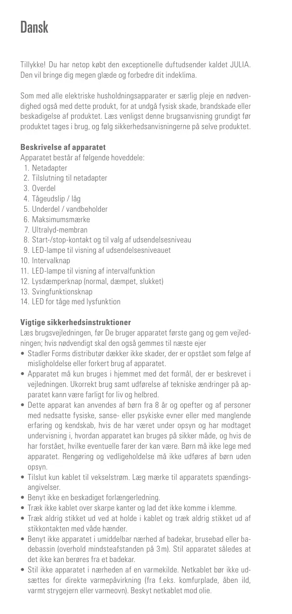 Tillykke! Du har netop kbt den exceptionelle duftudsender kaldet JULIA. Den vil bringe dig megen glade og forbedre dit indeklima.