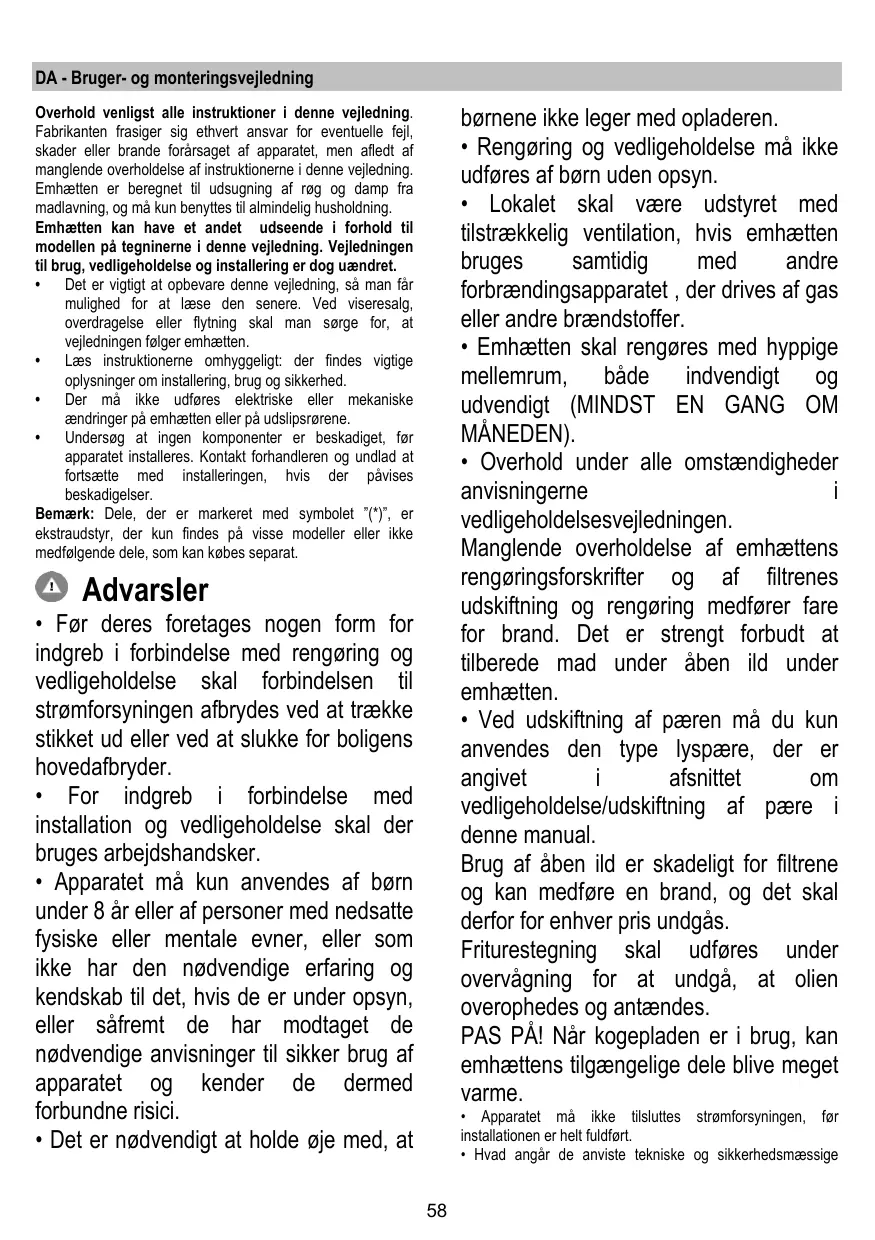 + La pièce doit avoir une aération suffisante lorsque la hotte est utilisée conjointement avec d'autres appareils fonctionnant au gaz ou autres combustibles.