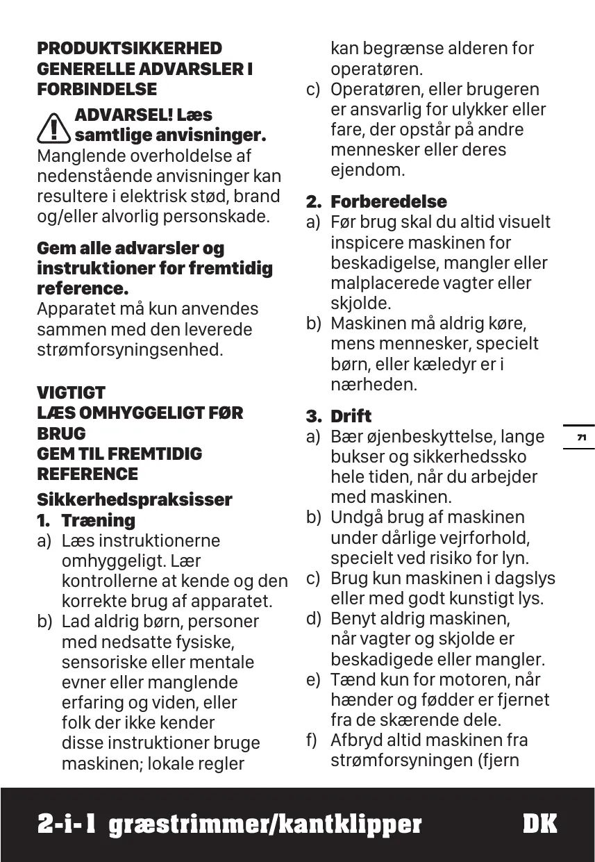 épais. Tenir la poignée frontale d'une main et la poignée auxiliaire de l'autre. Maintenir l'appareil au-dessous du niveau de la ceinture. Travailler uniquement de droit à gauche afin de s'assurer que les débris ne sont pas projetés en direction de l'opérateur. Sans se pencher, maintenir le fil à proximité du sol et parallèle à celui-ci (perpendiculaire lors de la coupe des bordures) et non appuyé sur la surface à tondre.