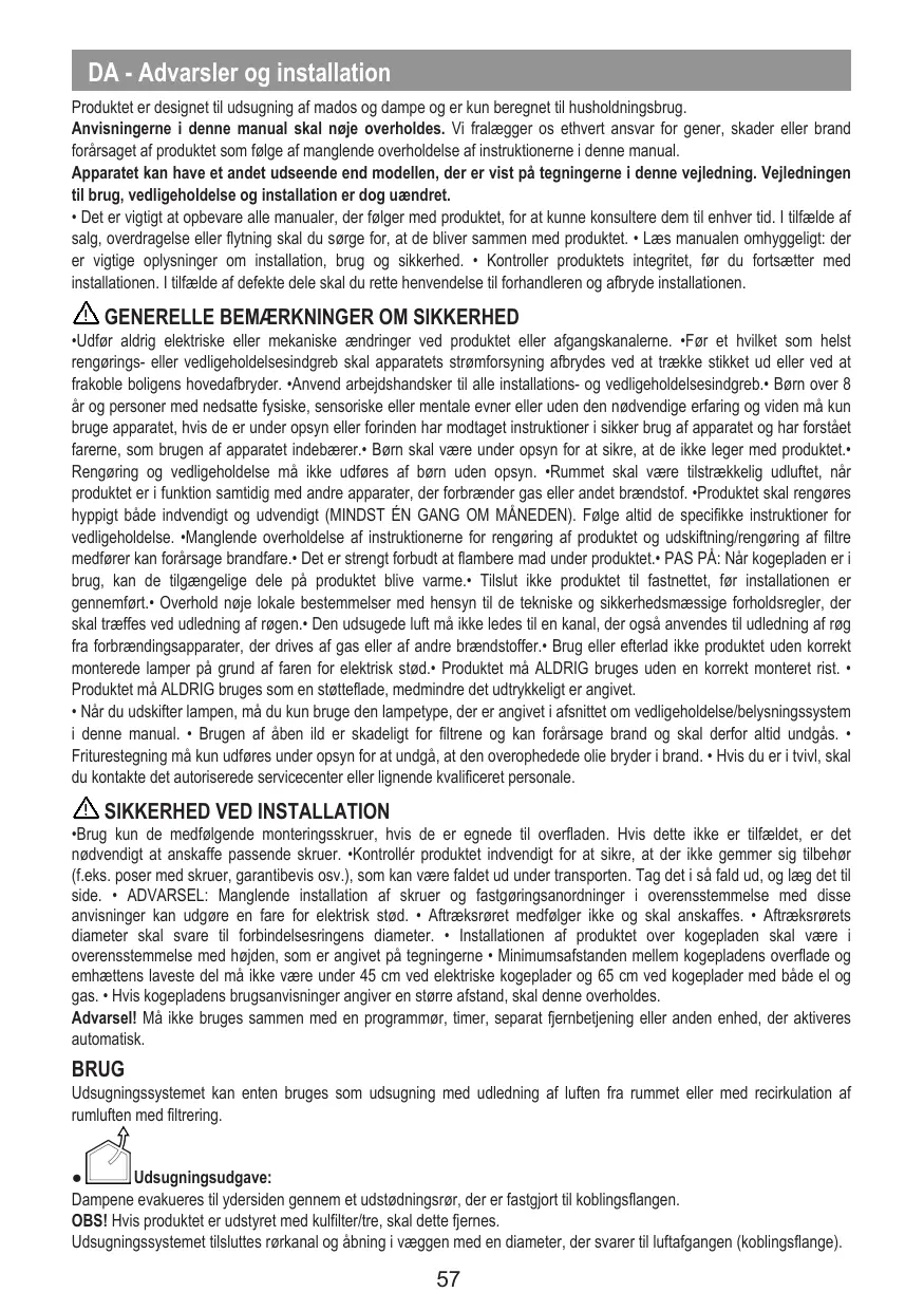 Stictement interdit de faire flamber des aliments sous le produit.» ATTENTION : Lorsque la plaque de cuisson est en marche, les paries accessibles du produit peuvent devenir chaudes.+ Ne pas brancher le produit au secteur électrique tant que l'installation n'est pas totalement terminée.+ Concemant les mesures techniques et de sécurité à prendre pour l'évacuation des fumées, respecter scrupuleusement les règlementations établies par les autorités locales compétentes.» L'air aspiré ne doi pas être conduit vers le tube destiné à l'évacuation des fumées des appareils à combustion à gaz où autres combustibles.» Ne pas utiliser ni laisser le produit sans que les ampoules ne soient correctement montées en raison du risque possible de décharge électrique. Le produit ne doit JAMAIS être utilisé sans la grille correctement montée. + Le produit ne doit JAMAIS être utlisé comme plan à moins que cela ne soit explicitement indiqué.