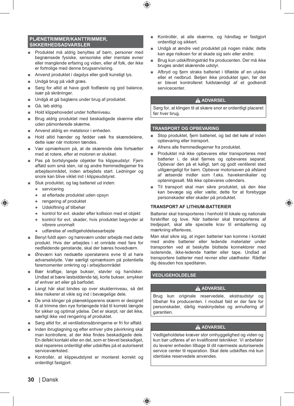 Débarrassez l'appareil de tous les corps étrangers. N'entreposez et ne transportez pas le produit équipé d'une batterie. Retirez-la et fixez-la séparément. Rangez-le dans un endroit frais, sec et correctement ventilé, hors de portée des enfants. Ne le rangez pas à proximité d'agents corrosifs tels que des produits chimiques de jardinage ou des sels de dégel. Ne le rangez pas à l'extérieur. = Pour le transport, attachez le produit pour l'empêcher de bouger ou de tomber, afin d'éviter toute blessure et tout dommage matériel.