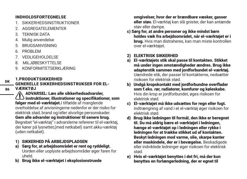 1. SIKKERHEDSINSTRUKTIONER eller stav. Ekværkto) kan slà gnister, der kan antænde stov eller dampe 2. AGGREGATELEMENTER c) Sarg for, at andre personer og ikke mindst bem 3. TEKNISK DATA holdes væk fra arbejdsomrädet, när el-værktgjet er i 4. Mulig anvendelse brug. Hvis man distraheres, kan man miste kontrollen 5. BRUGSANVISNING over el-værktojet. Sos 2) ELEKTRISK SIKKERHED 7. VEDLIGEHOLDELSE 2) El-værktojets stik skal passe til kontakten. Stikket 8. MILJABESKYTTELSE mà under ingen omstændigheder ændres. Brug ikke 9. KONFORMITETSERKLÆRING adapterstik sammen med jordforbundet el-værktoÿ. Uændrede stik, der passer til kontakterne, nedsætter Dk 1.PRODUKTSIKKERHED risikoen for elektrisk stod. ———— GENERELLE SIKKERHEDSINSTRUKSER FOR EL- b) Undgä kropskontakt med jordforbundne overflader 36 VÆRKTOJ som f.eks. ror, radiatorer, komfurer og koleskabe. ADVARSEL: Læs alle sikkerhedsadvarsler, Hvis din krop er jordforbundet, ages risikoen for instruktioner,illustrationer og specifikationer, som elektrisk stod. folger med el-værktajet.| tilfælde af manglende c) El-værktojet mà ikke udsættes for regn eller fugt. overholdelse af anvisningerne nedenfor er der risiko for Indtrængning af vand i et el-værktoj ager risikoen for elektrisk stod, brand og/eller alvorlige personskader. elektrisk stod. Gem alle advarsler og instruktioner til senere brug. d) Brug ikke ledningen til formäl, den ikke er beregnet Begrebet “ekværktoj” | advarslerne refererer til ekværktoj, til. Du mé aldrig bære el-værktojet i ledningen, der karer pâ lysnettet (med netkabel) samt akku-værktoj hænge el-værktajet op i ledningen eller rykke i (uden netkabel) ledningen for at trække stikket ud af kontakten. k Beskyt ledningen mod varme, olie, skarpe kanter 1) SIKKERHED PÀ ARBEJDSPLADSEN eller maskindele, der er i bevægelse. Beskadigede 2) Sorg for, at arbejdsomrädet er rent og ryddeligt. eller indviklede ledninger ager risikoen for elektrisk Uorden eller uoplyste arbejdsomräder eger faren for stod