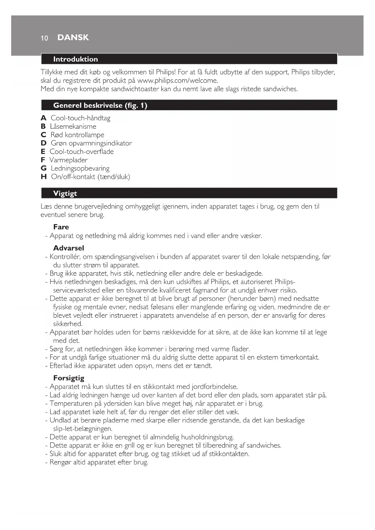 Tillykke med dit køb og velkommen til Philips! For at få fuldt udbytte af den support, Philips tilbyder, skal du registrere dit produkt på www.philips.com/welcome. Med din nye kompakte sandwichtoaster kan du nemt lave alle slags ristede sandwiches.