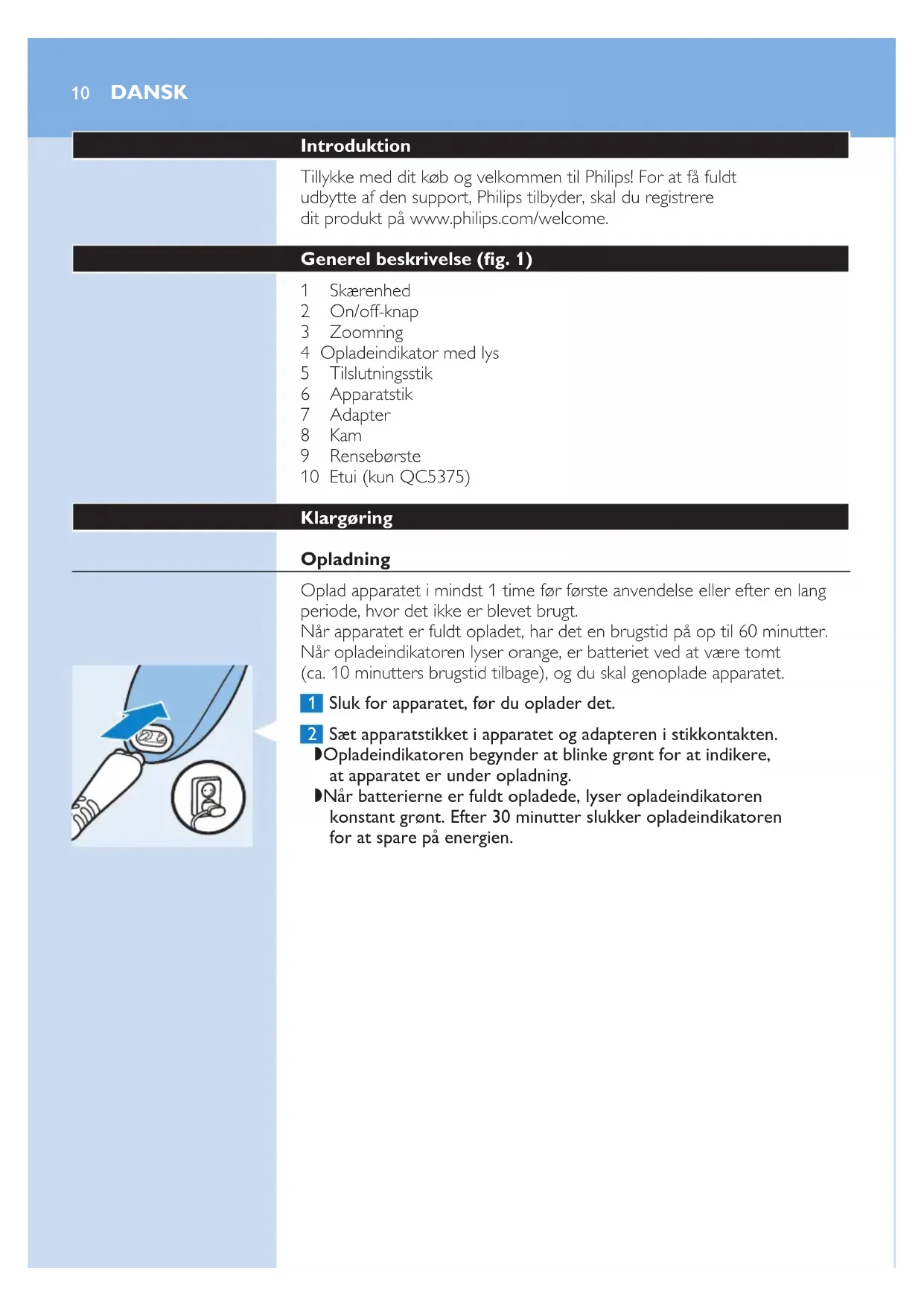 Oplad apparatet i mindst 1 time før første anvendelse eller efter en lang