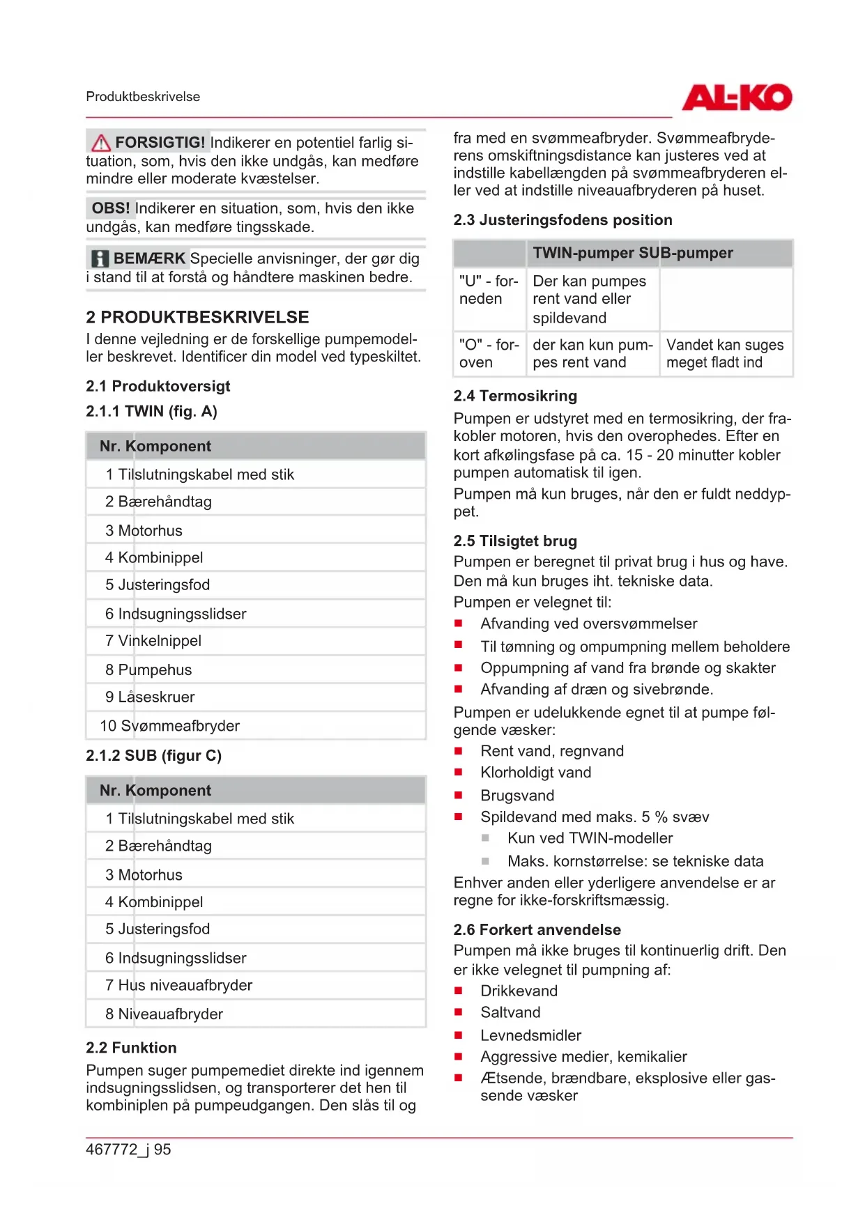 FARE! Indikerer en umiddelbar farlig situati- on, som, hvis den ikke undgås, er livsfarlig eller medfører alvorlige kvæstelser. ADVARSEL! Indikerer en potentiel farlig si- tuation, som, hvis den ikke undgås, kan være livsfarlig eller medføre alvorlige kvæstelser.467772_j 95 Produktbeskrivelse FORSIGTIG! Indikerer en potentiel farlig si- tuation, som, hvis den ikke undgås, kan medføre mindre eller moderate kvæstelser. OBS! Indikerer en situation, som, hvis den ikke undgås, kan medføre tingsskade. BEMÆRK Specielle anvisninger, der gør dig i stand til at forstå og håndtere maskinen bedre. 2 PRODUKTBESKRIVELSE I denne vejledning er de forskellige pumpemodel- ler beskrevet. Identificer din model ved typeskiltet.