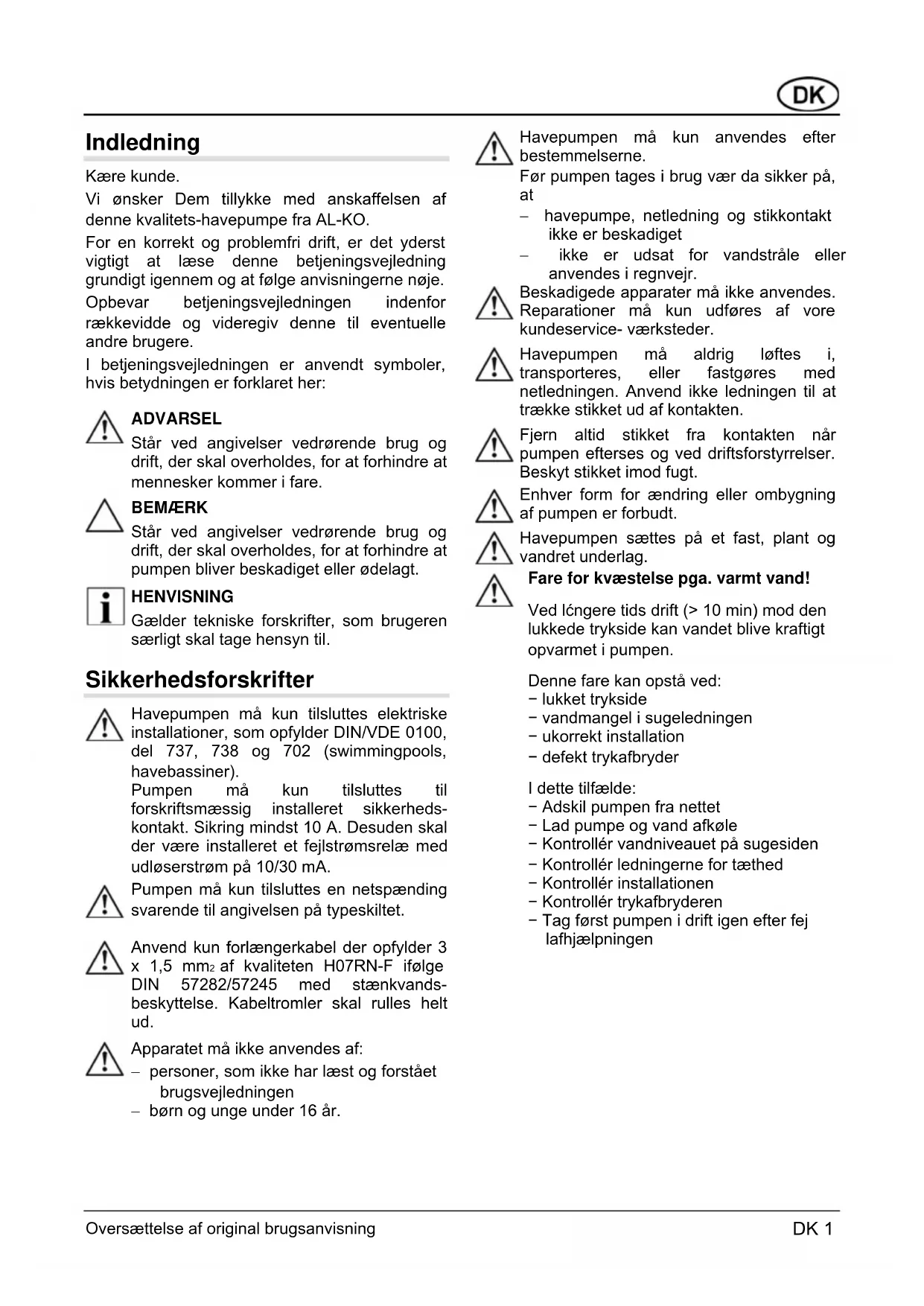 Als het niet lukt om de problemen te verhelpen, wordt aangeraden om zich tot het dichtstbijzijnde Servicecentrum van AL-KO te wenden. NL 4 Vertaling van de originele gebruikershandleidingIndledning Kære kunde. Vi ønsker Dem tillykke med anskaffelsen af denne kvalitets-havepumpe fra AL-KO. For en korrekt og problemfri drift, er det yderst vigtigt at læse denne betjeningsvejledning grundigt igennem og at følge anvisningerne nøje. Opbevar betjeningsvejledningen indenfor rækkevidde og videregiv denne til eventuelle andre brugere. I betjeningsvejledningen er anvendt symboler, hvis betydningen er forklaret her: