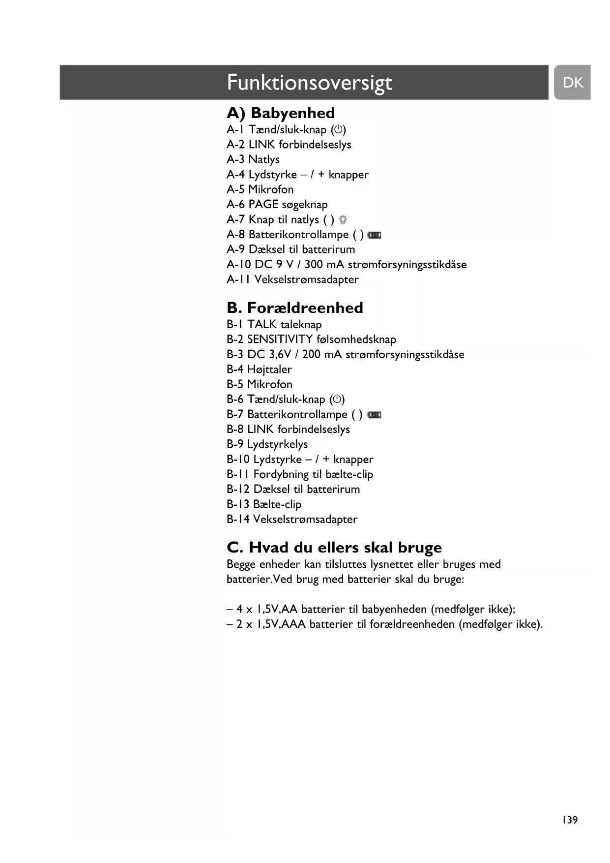 – 4 x 1,5V,AA batterier til babyenheden (medfølger ikke);