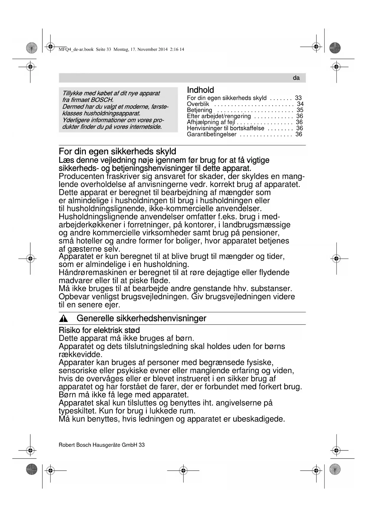 MFQ4_de-ar.book Seite 32 Montag, 17. November 2014 2:16 1433Robert Bosch Hausgeräte GmbH 33 Indhold For din egen sikkerheds skyld . . . . . . . 33Overblik . . . . . . . . . . . . . . . . . . . . . . . . 34Betjening . . . . . . . . . . . . . . . . . . . . . . . 35Efter arbejdet/rengøring . . . . . . . . . . . . 36Afhjælpning af fejl . . . . . . . . . . . . . . . . . 36Henvisninger til bortskaffelse . . . . . . . . 36Garantibetingelser . . . . . . . . . . . . . . . . 36 For din egen sikkerheds skyld