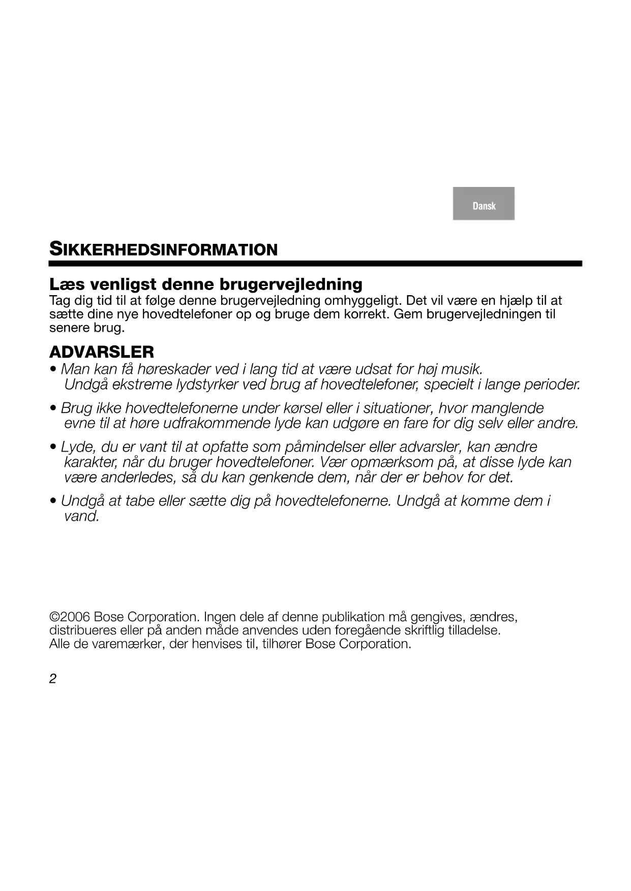 ©2006 Bose Corporation. Ingen dele af denne publikation må gengives, ændres,