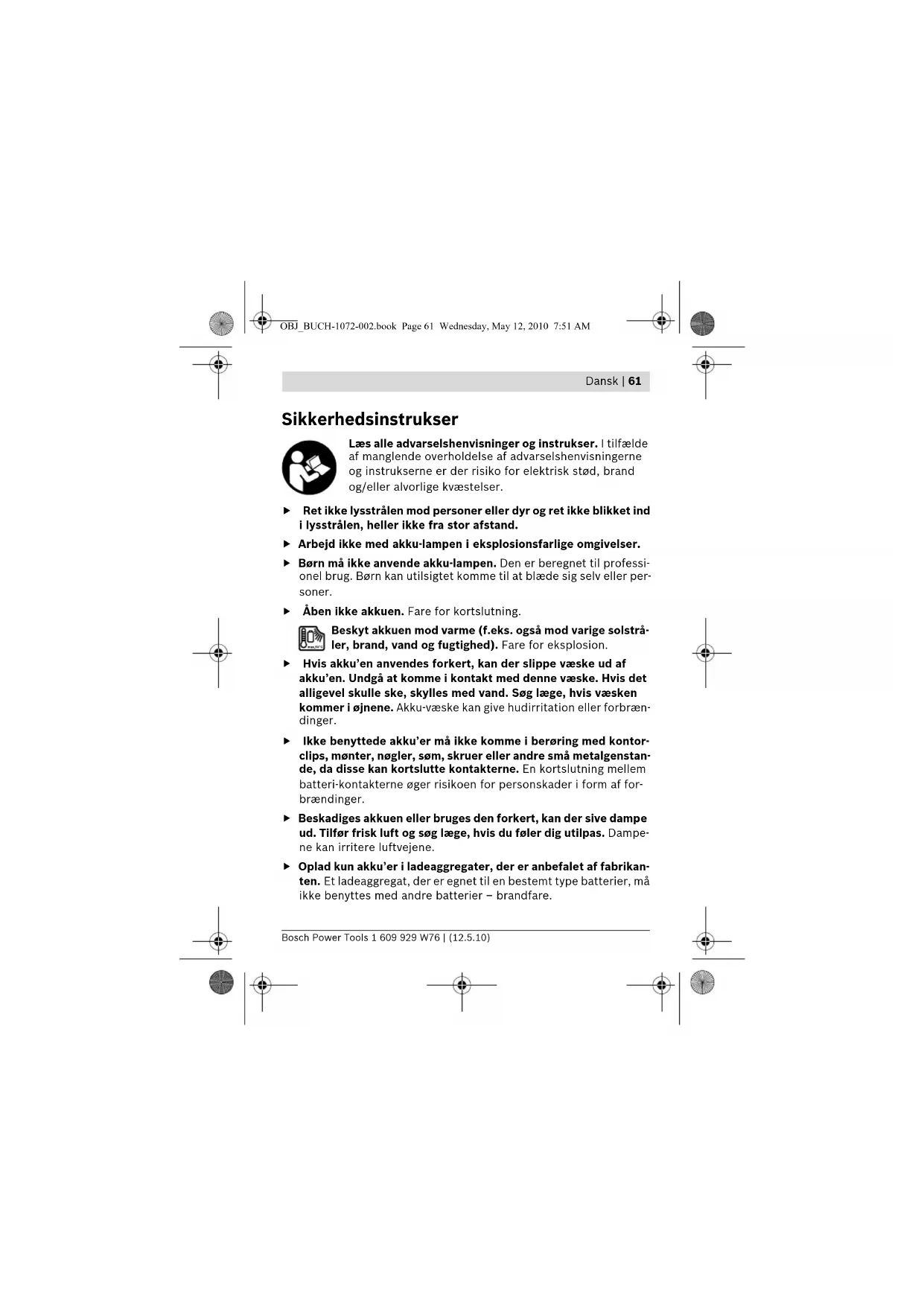 Sikkerhedsinstrukser Læs alle advarselshenvisninger og instrukser. I tilfælde af manglende overholdelse af advarselshenvisningerne og instrukserne er der risiko for elektrisk stød, brand og/eller alvorlige kvæstelser. f Ret ikke lysstrålen mod personer eller dyr og ret ikke blikket ind i lysstrålen, heller ikke fra stor afstand. f Arbejd ikke med akku-lampen i eksplosionsfarlige omgivelser. f Børn må ikke anvende akku-lampen. Den er beregnet til professi- onel brug. Børn kan utilsigtet komme til at blæde sig selv eller per- soner. f Åben ikke akkuen. Fare for kortslutning. Beskyt akkuen mod varme (f.eks. også mod varige solstrå- ler, brand, vand og fugtighed). Fare for eksplosion. f Hvis akku’en anvendes forkert, kan der slippe væske ud af akku’en. Undgå at komme i kontakt med denne væske. Hvis det alligevel skulle ske, skylles med vand. Søg læge, hvis væsken kommer i øjnene. Akku-væske kan give hudirritation eller forbræn- dinger. f Ikke benyttede akku’er må ikke komme i berøring med kontor- clips, mønter, nøgler, søm, skruer eller andre små metalgenstan- de, da disse kan kortslutte kontakterne. En kortslutning mellem batteri-kontakterne øger risikoen for personskader i form af for- brændinger. f Beskadiges akkuen eller bruges den forkert, kan der sive dampe ud. Tilfør frisk luft og søg læge, hvis du føler dig utilpas. Dampe- ne kan irritere luftvejene. f Oplad kun akku’er i ladeaggregater, der er anbefalet af fabrikan- ten. Et ladeaggregat, der er egnet til en bestemt type batterier, må ikke benyttes med andre batterier – brandfare. OBJ_BUCH-1072-002.book Page 61 Wednesday, May 12, 2010 7:51 AM1 609 929 W76 | (12.5.10) Bosch Power Tools 62 | Dansk f Anvend kun akkuen i forbindelse med dit Bosch el-værktøj. Kun på denne måde beskyttes akkuen mod farlig overbelastning. f Anvend kun originale akkuer fra Bosch, der skal have den spæn- ding, der er angivet på dit el-værktøjs typeskilt. Bruges andre ak- kuer som f.eks. efterligninger, istandsatte akkuer eller fremmede fabrikater er der fare for kvæstelser samt tingskader, da akkuerne kan eksplodere. Funktionsbeskrivelse Beregnet anvendelse Akku-lampen er beregnet til håndført, rummeligt begrænset oplys- ning i tørre områder. Illustrerede komponenter Nummereringen af de illustrerede komponenter refererer til illustra- tionen af akku-lampen på illustrationssiden. 1 Lampehoved 2 Start-stop-kontakt 3 Akku* 4 Akku-udløserknap 5 Bælteholdeclip *Tilbehør, som er illustreret og beskrevet i betjeningsvejledningen, er ikke in- deholdt i leveringen. Det fuldstændige tilbehør findes i vores tilbehørspro- gram. OBJ_BUCH-1072-002.book Page 62 Wednesday, May 12, 2010 7:51 AMDansk | 63 Bosch Power Tools 1 609 929 W76 | (12.5.10) Tekniske data Montering Opladning af akku (tilbehør) (se Fig. A) f Brug kun de ladeaggregater, der findes på tilbehørssiden. Kun disse ladeaggregater er afstemt i forhold til den Li-ion-akku, der bruges på din akku-lampe. Bemærk: Akkuen er til dels oplades ved udleveringen. For at sikre at akkuen fungerer 100 % oplades akkuen helt før første ibrugtagning. Li-ion-akkuen kan oplades til enhver tid, uden at levetiden forkortes. En afbrydelse af opladningen beskadiger ikke akkuen. Li-ion-akkuen er beskyttet mod afladning med „Electronic Cell Pro- tection (ECP)“. Er akkuen afladet, slukkes akku-lampen med en be- skyttelseskontakt. Akku-lampe GLI 10,8 V-LI Professional Typenummer 3 601 D37 U.. Nominel spænding V= 10,8 Tændetid, ca. min 450 Driftstemperatur °C – 10 ... +40 Opbevaringstemperatur °C – 15 ... +50 Vægt svarer til EPTA-Procedure 01/2003 kg 0,3 Læg mærke til typenummeret på typeskiltet til din akku-lampe. Handelsbeteg- nelserne for de enkelte akku-lamper kan variere. OBJ_BUCH-1072-002.book Page 63 Wednesday, May 12, 2010 7:51 AM1 609 929 W76 | (12.5.10) Bosch Power Tools 64 | Dansk Tryk efter automatisk slukning af akku-lampen ikke mere på start-stop-kontakten. Akkuen kan blive beska- diget. Akkuen tages ud 3 ved at trykke på udløsertasterne 4 og trække ak- kuen bagud og ud af akku-lampen. Undgå brug af vold. Akkuen er udstyret med en NTC-temperaturovervågning, som kun til- lader en opladning i temperaturområdet mellem 0 °C og 45 °C. Der- ved opnås en høj levetid for akkuen. Læs og overhold henvisningerne mhr. bortskaffelse. Brug Ibrugtagning Isæt akku f Anvend kun originale li-ion-akkuer fra Bosch, der skal have den spænding, der er angivet på din akku-lampes typeskilt. Brug af andre akku’er øger risikoen for personskader og er forbundet med brandfare. Anbring den ladede akku 3 i grebet, til den falder rigtigt i hak og flug- ter med grebets kant. Tænd/sluk f Akku-lampen udsender en lysstråle, der kommer ud af lyshove- det 1. Tryk til ibrugtagning af akku-lampen på start-stop-kontakten 2. Akku-lampen slukkes ved at trykke på start-stop-kontakten 2 en gang til. PAS PÅ OBJ_BUCH-1072-002.book Page 64 Wednesday, May 12, 2010 7:51 AMDansk | 65 Bosch Power Tools 1 609 929 W76 | (12.5.10) Beskyttelse mod dybdeafladning Li-ion-akkuen er beskyttet mod afladning med „Electronic Cell Pro- tection (ECP)“. Er akkuen afladet, slukkes akku-lampen med en be- skyttelseskontakt. Arbejdsvejledning Bælteholdeclip (se Fig. B) Med bælteholdeclippen 5 kan du hænge akku-lampen fast i f.eks. et bælte. Derved har du begge hænder fri og akku-lampen er lige ved hånden. Vedligeholdelse og service Vedligeholdelse og rengøring Når akkuen ikke fungerer mere, bedes du kontakte et autoriseret ser- viceværksted for Bosch el-værktøj. Akku-lampen er vedligeholdelsesfri og består ikke af dele, der skal skiftes eller vedligeholdes. Rengør kun kunststofskiven på akku-lampen med en tør, blød klud for at undgå beskadigelser. Anvend ikke rengørings- eller opløsningsmid- ler. Skulle akku-lampen trods omhyggelig fabrikation og kontrol engang holde op at fungere, skal reparationen udføres af et autoriseret ser- viceværksted for Bosch-elekt