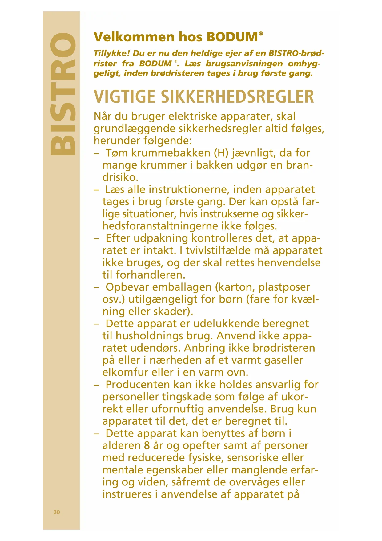 . Læs brugsanvisningen omhyg- geligt, inden brødristeren tages i brug første gang. VIGTIGE SIKKERHEDSREGLER Når du bruger elektriske apparater, skal grundlæggende sikkerhedsregler altid følges, herunder følgende: – Tøm krummebakken (H) jævnligt, da for mange krummer i bakken udgør en bran- drisiko. – Læs alle instruktionerne, inden apparatet tages i brug første gang. Der kan opstå far- lige situationer, hvis instrukserne og sikker- hedsforanstaltningerne ikke følges. – Efter udpakning kontrolleres det, at appa- ratet er intakt. I tvivlstilfælde må apparatet ikke bruges, og der skal rettes henvendelse til forhandleren. – Opbevar emballagen (karton, plastposer osv.) utilgængeligt for børn (fare for kvæl- ning eller skader). – Dette apparat er udelukkende beregnet til husholdnings brug. Anvend ikke appa- ratet udendørs. Anbring ikke brødristeren på eller i nærheden af et varmt gaseller elkomfur eller i en varm ovn. – Producenten kan ikke holdes ansvarlig for personeller tingskade som følge af ukor- rekt eller ufornuftig anvendelse. Brug kun apparatet til det, det er beregnet til. – Dette apparat kan benyttes af børn i alderen 8 år og opefter samt af personer med reducerede fysiske, sensoriske eller mentale egenskaber eller manglende erfar- ing og viden, såfremt de overvåges eller instrueres i anvendelse af apparatet på31 BRUGSANVISNING sikker vis og forstår de risici, der er involv- eret. Børn må ikke lege med apparatet. Rengøring og brugervedligeholdelse må ikke foretages af børn under 8 år eller af børn, der ikke overvåges. Opbevar appara- tet og dets ledning utilgængeligt for børn under 8 år. – Apparatet må ikke berøres med fugtige eller våde hænder. Undgå at røre ved led- ningen eller stikket med våde hænder. Træk altid stikket ud af apparatet ved at holde i stikket, ikke i ledningen. Lad ikke ledningen hænge ud over bordkanten eller komme i kontakt med varme flader. Brug ikke apparatet, hvis ledning eller stik er beskadiget, eller hvis apparatet på nogen måde svigter, eller er blevet beskadiget. Send apparatet tilbage til det nærmeste autoriserede servicecenter for undersø- gelse, reparation eller justering. – For at undgå fare, returnér da apparatet til nærmeste autoriserede serviceforhandler til undersøgelse, reparation eller justering. – Brug ikke tilbehør, som ikke er anbefalet af producenten. Dette kan medføre brand, elektrisk stød eller personskader. – Sluk for apparatet, hvis der opstå fejl. Forsøg ikke selv at reparere det. Lad kun apparatet reparere af et kundeservicev- ærksted, som er godkendt af producenten. Manglende overholdelse af ovenstående sikkerhedsforanstaltninger kan forringe apparatets sikkerhed. – Forsøg aldrig selv at udskifte apparatets led- ninger, da dette kræver brug af specialværk- tøj. For at bevare apparatets sikkerhed må ledninger kun repareres eller udskiftes af et af producenten godkendt serviceværksted. – Tag altid stikket ud af stikkontakten, når32 BISTRO du ikke bruger apparatet, eller når det skal rengøres. Lad apparatet køle af, før du tilføjer eller fjerner dele. Nedsænk aldrig ledningen, stikket eller nogen anden del af apparatet i vand: Dette er vigtigt at huske på i forbindelse med elektriske apparater. Rengørkun apparatet ved hjælp af en børste eller fugtig klud. – For at afbryde, skal du dreje kontrollen til “off”, og derefter fjerne stikket fra stikkon- takten. – Nedsænk aldrig ledningen, stikket eller apparatet i vand eller anden væske, da der er risiko for brand, elektrisk stød og per- sonskade. – Undlad at anbringe hænderne på brødris- teren, når den er sluttet til lysnettet og er tændt. – Placér ikke foliebelagte, overdimension- erede fødevarer eller køkkenredskaber i brødristeren, da de kan indebære en risiko for brand eller elektrisk stød. – Undlad at komme skarpe eller slibende genstande i brød-risteren, da de kan forår- sage skade. – Siderne på brødristeren og området omkring brødristerne bliver meget varme under brug: Rør derfor kun ved plast-knap- perne og grebene, når du bruger brødris- teren. – Undlad at tildække brødristeren, når den er i brug. – Undlad at vikle ledningen omkring brødris- teren under eller efter brug. Opbevar i ste- det ledningen i holderen på undersiden af brødristeren. – Der kan opstå brand i brødristeren, hvis den tildækkes eller kommer i kontakt med brandbare materialer som for eksempel33 BRUGSANVISNING gardiner, tøj, tapet eller lignende. – Tag aldrig brødet ud af brødristeren, mens den er tændt. – Brødet kan bryde i brand, og af samme årsag må brødristeren ikke benyttes i nærheden eller under brændbare materi- aler såsom gardiner. Brødristeren skal over- våges ved brug. – Brødristen må ikke bruges med ekstern timer eller separat fjernbetjening. FORSIGTIG! Vær særligt opmærksom på de varme flader! Risiko for forbrændinger. GEM DENNE BRUGSANVISNING POLARISATION Kun for kunder i USA/Canada: Dette apparat har et polari-seret stik (et ben er bredere end det andet). For at mindske risikoen for elektrisk stød, vil dette stik kun passe ind i en polariseret stikkontakt på én måde. Hvis stikket ikke passer helt ind i kontakten, så vend stikket om. Hvis det stadig ikke passer, skal du kontakte en uddannet elektriker. Du må ikke ændre stikket på nogen måde. KUN TIL HUSHOLDNINGSBRUG34 BISTRO