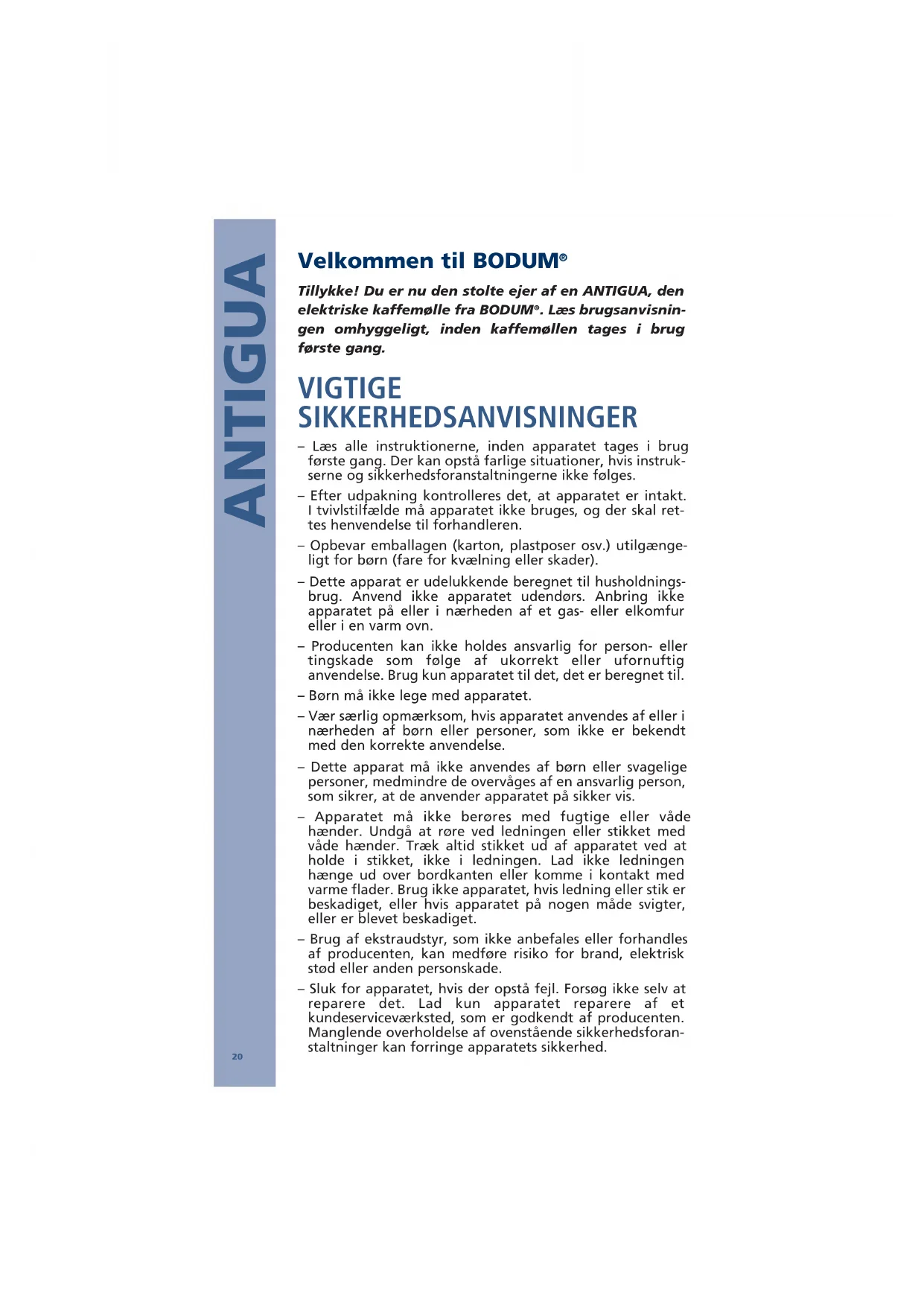 . Læs brugsanvisnin- gen omhyggeligt, inden kaffemøllen tages i brug første gang. VIGTIGE SIKKERHEDSANVISNINGER – Læs alle instruktionerne, inden apparatet tages i brug første gang. Der kan opstå farlige situationer, hvis instruk- serne og sikkerhedsforanstaltningerne ikke følges. – Efter udpakning kontrolleres det, at apparatet er intakt. I tvivlstilfælde må apparatet ikke bruges, og der skal ret- tes henvendelse til forhandleren. – Opbevar emballagen (karton, plastposer osv.) utilgænge- ligt for børn (fare for kvælning eller skader). – Dette apparat er udelukkende beregnet til husholdnings- brug. Anvend ikke apparatet udendørs. Anbring ikke apparatet på eller i nærheden af et gas- eller elkomfur eller i en varm ovn. – Producenten kan ikke holdes ansvarlig for person- eller tingskade som følge af ukorrekt eller ufornuftig anvendelse. Brug kun apparatet til det, det er beregnet til. – Børn må ikke lege med apparatet. – Vær særlig opmærksom, hvis apparatet anvendes af eller i nærheden af børn eller personer, som ikke er bekendt med den korrekte anvendelse. – Dette apparat må ikke anvendes af børn eller svagelige personer, medmindre de overvåges af en ansvarlig person, som sikrer, at de anvender apparatet på sikker vis. – Apparatet må ikke berøres med fugtige eller våde hænder. Undgå at røre ved ledningen eller stikket med våde hænder. Træk altid stikket ud af apparatet ved at holde i stikket, ikke i ledningen. Lad ikke ledningen hænge ud over bordkanten eller komme i kontakt med varme flader. Brug ikke apparatet, hvis ledning eller stik er beskadiget, eller hvis apparatet på nogen måde svigter, eller er blevet beskadiget. – Brug af ekstraudstyr, som ikke anbefales eller forhandles af producenten, kan medføre risiko for brand, elektrisk stød eller anden personskade. – Sluk for apparatet, hvis der opstå fejl. Forsøg ikke selv at reparere det. Lad kun apparatet reparere af et kundeserviceværksted, som er godkendt af producenten. Manglende overholdelse af ovenstående sikkerhedsforan- staltninger kan forringe apparatets sikkerhed.22 ANTIGUA BESKRIVELSE