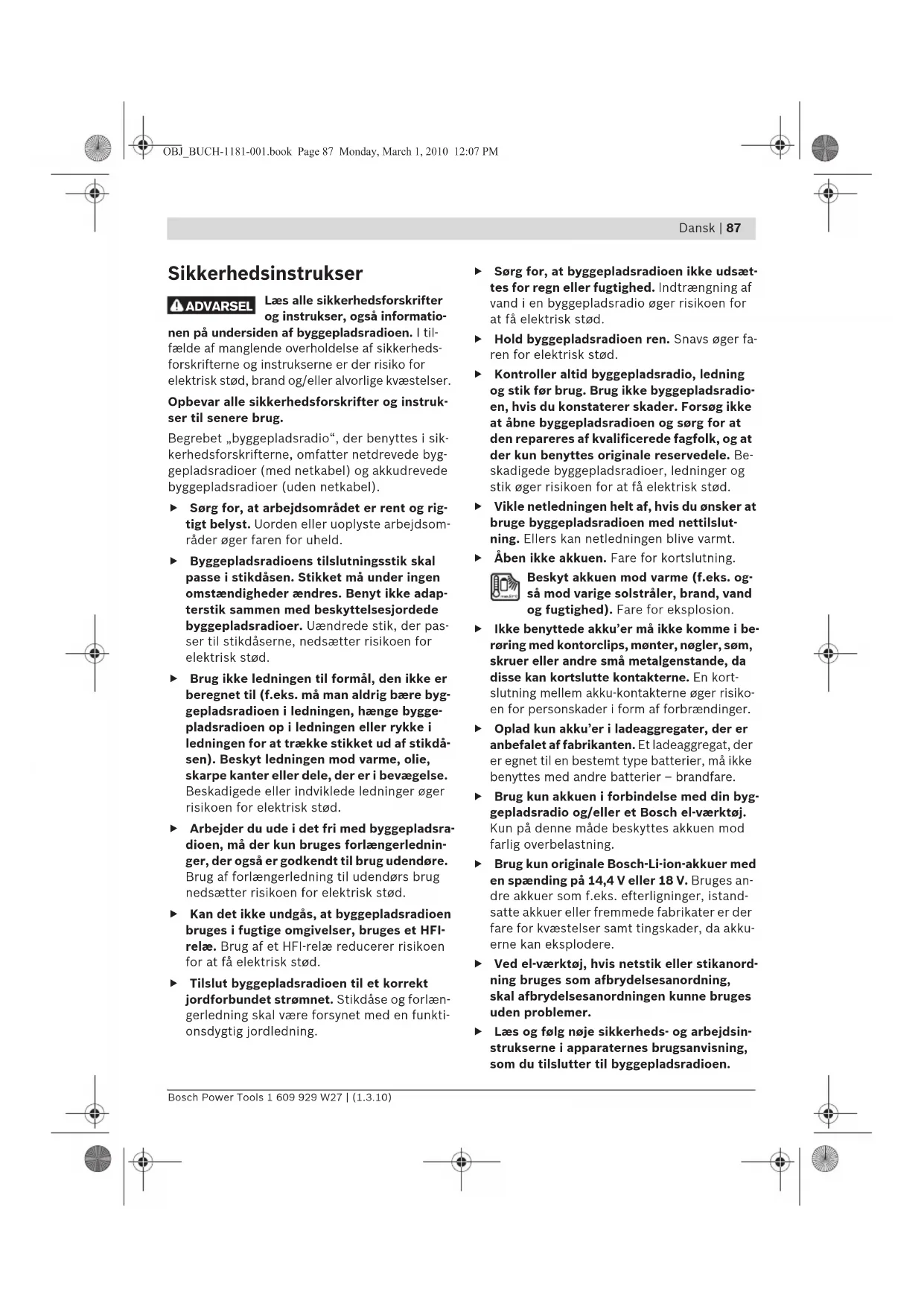 Sikkerhedsinstrukser Læs alle sikkerhedsforskrifter og instrukser, også informatio- nen på undersiden af byggepladsradioen. I til- fælde af manglende overholdelse af sikkerheds- forskrifterne og instrukserne er der risiko for elektrisk stød, brand og/eller alvorlige kvæstelser. Opbevar alle sikkerhedsforskrifter og instruk- ser til senere brug. Begrebet „byggepladsradio“, der benyttes i sik- kerhedsforskrifterne, omfatter netdrevede byg- gepladsradioer (med netkabel) og akkudrevede byggepladsradioer (uden netkabel). f Sørg for, at arbejdsområdet er rent og rig- tigt belyst. Uorden eller uoplyste arbejdsom- råder øger faren for uheld. f Byggepladsradioens tilslutningsstik skal passe i stikdåsen. Stikket må under ingen omstændigheder ændres. Benyt ikke adap- terstik sammen med beskyttelsesjordede byggepladsradioer. Uændrede stik, der pas- ser til stikdåserne, nedsætter risikoen for elektrisk stød. f Brug ikke ledningen til formål, den ikke er beregnet til (f.eks. må man aldrig bære byg- gepladsradioen i ledningen, hænge bygge- pladsradioen op i ledningen eller rykke i ledningen for at trække stikket ud af stikdå- sen). Beskyt ledningen mod varme, olie, skarpe kanter eller dele, der er i bevægelse. Beskadigede eller indviklede ledninger øger risikoen for elektrisk stød. f Arbejder du ude i det fri med byggepladsra- dioen, må der kun bruges forlængerlednin- ger, der også er godkendt til brug udendøre. Brug af forlængerledning til udendørs brug nedsætter risikoen for elektrisk stød. f Kan det ikke undgås, at byggepladsradioen bruges i fugtige omgivelser, bruges et HFI- relæ. Brug af et HFI-relæ reducerer risikoen for at få elektrisk stød. f Tilslut byggepladsradioen til et korrekt jordforbundet strømnet. Stikdåse og forlæn- gerledning skal være forsynet med en funkti- onsdygtig jordledning. f Sørg for, at byggepladsradioen ikke udsæt- tes for regn eller fugtighed. Indtrængning af vand i en byggepladsradio øger risikoen for at få elektrisk stød. f Hold byggepladsradioen ren. Snavs øger fa- ren for elektrisk stød. f Kontroller altid byggepladsradio, ledning og stik før brug. Brug ikke byggepladsradio- en, hvis du konstaterer skader. Forsøg ikke at åbne byggepladsradioen og sørg for at den repareres af kvalificerede fagfolk, og at der kun benyttes originale reservedele. Be- skadigede byggepladsradioer, ledninger og stik øger risikoen for at få elektrisk stød. f Vikle netledningen helt af, hvis du ønsker at bruge byggepladsradioen med nettilslut- ning. Ellers kan netledningen blive varmt. f Åben ikke akkuen. Fare for kortslutning. Beskyt akkuen mod varme (f.eks. og- så mod varige solstråler, brand, vand og fugtighed). Fare for eksplosion. f Ikke benyttede akku’er må ikke komme i be- røring med kontorclips, mønter, nøgler, søm, skruer eller andre små metalgenstande, da disse kan kortslutte kontakterne. En kort- slutning mellem akku-kontakterne øger risiko- en for personskader i form af forbrændinger. f Oplad kun akku’er i ladeaggregater, der er anbefalet af fabrikanten. Et ladeaggregat, der er egnet til en bestemt type batterier, må ikke benyttes med andre batterier – brandfare. f Brug kun akkuen i forbindelse med din byg- gepladsradio og/eller et Bosch el-værktøj. Kun på denne måde beskyttes akkuen mod farlig overbelastning. f Brug kun originale Bosch-Li-ion-akkuer med en spænding på 14,4 V eller 18 V. Bruges an- dre akkuer som f.eks. efterligninger, istand- satte akkuer eller fremmede fabrikater er der fare for kvæstelser samt tingskader, da akku- erne kan eksplodere. f Ved el-værktøj, hvis netstik eller stikanord- ning bruges som afbrydelsesanordning, skal afbrydelsesanordningen kunne bruges uden problemer. f Læs og følg nøje sikkerheds- og arbejdsin- strukserne i apparaternes brugsanvisning, som du tilslutter til byggepladsradioen. ADVARSEL OBJ_BUCH-1181-001.book Page 87 Monday, March 1, 2010 12:07 PM88 | Dansk 1 609 929 W27 | (1.3.10) Bosch Power Tools Funktionsbeskrivelse Læs alle advarselshenvisninger og instrukser. I tilfælde af manglende overholdelse af advarselshenvisnin- gerne og instrukserne er der risiko for elektrisk stød, brand og/eller al- vorlige kvæstelser. Tekniske data Illustrerede komponenter Nummereringen af de illustrerede komponenter refererer til illustrationen af byggepladsradioen på grafiksiden. 1 Højttaler 2 Bæregreb 3 Kontrollampe tilslutning af vekselstrøm (ikke ved typenummer 3 601 D29 760) 4 Beskyttelsesklap tilslutning af vekselstrøm (ikke ved typenummer 3 601 D29 760) 5 Stikdåse tilslutning af vekselstrøm (ikke ved typenummer 3 601 D29 760) 6 Fastlåsning af låg til batterirum (bufferbatterier) 7 Låg til batterirum (bufferbatterier) 8 Låsearm til låg til medierum 9 Låg til medierum 10 Stavantenne 11 Akkuskakt 12 Låsearm til låg til akkurum 13 Låg til akkurum 14 Akku* 15 Taste til forindstilling af klang „Equalizer“ 16 Programmeringstaste „Memory“ 17 Taste til manuel indstilling af klang „Custom“ 18 Taste til indstilling af tid „Clock“ 19 Drejeknap til indstilling af sender „Tune“ 20 Taste tilfældighedsafspilning/afspilnings- gentagelse 21 Taste til opadsøgning „Seek +/>>|“ 22 Taste til valg af audiokilde „Source“ 23 Taste til nedadsøgning „|<</– Seek“ 24 Taste afspilning/pause 25 Drejeknap til indstilling af lydstyrke („Volume“) og klang („Bass/Treb“) 26 Start-stop-taste audiofunktion 27 Display 28 „AUX 1 IN“-bøsning Byggepladsradio GML 20 Professional Typenummer 3 601 D29 7.. Bufferbatterier 2x1,5 V (LR06/AA) Akku 14,4–18 V Driftstemperatur °C 0...45 Opbevarings- temperatur °C –20...+70 Vægt svarer til EPTA- Procedure 01/2003 kg 10,2 Beskyttelsesklasse /I Tæthedsgrad IP 54 (støv- og sprøjtevands- beskyttet) Audiofunktion/radio Driftsspænding – ved netdrift – ved akkufunktion