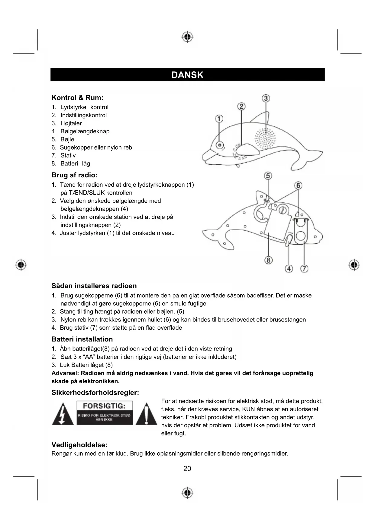 Advarsel: Radioen må aldrig nedsænkes i vand. Hvis det gøres vil det forårsage uoprettelig skade på elektronikken. Sikkerhedsforholdsregler: For at nedsætte risikoen for elektrisk stød, må dette produkt, f.eks. når der kræves service, KUN åbnes af en autoriseret tekniker. Frakobl produktet stikkontakten og andet udstyr, hvis der opstår et problem. Udsæt ikke produktet for vand eller fugt. Vedligeholdelse: Rengør kun med en tør klud. Brug ikke opløsningsmidler eller slibende rengøringsmidler.21 Garanti: Ingen garanti og ikke noget ansvar kan påtages for ændringer af produktet eller for skade på grund af forkert brug af dette produkt. Generelt: Design og specifikationer kan ændres uden varsel. Alle bomærker og produktnavne er varemærker eller registrerede varemærker tilhørende deres respektive ejere og anses herved som sådan. Gem brugervejledningen og emballagen til senere brug. Bemærk: Dette produkt er mærket med dette symbol. Det betyder, at brugt elektrisk og elektronisk udstyr ikke må bortskaffes sammen med almindeligt husholdningsaffald. Der findes særlige indsamlingssystemer for disse produkter.