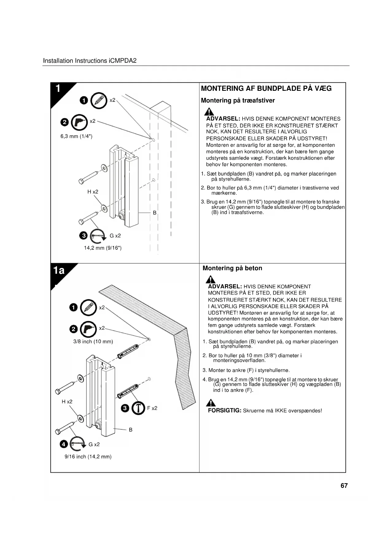 (G) gennem to flade slutteskiver (H) og vægpladen (B) ind i to ankre (F). FORSIGTIG: Skruerne må IKKE overspændes!