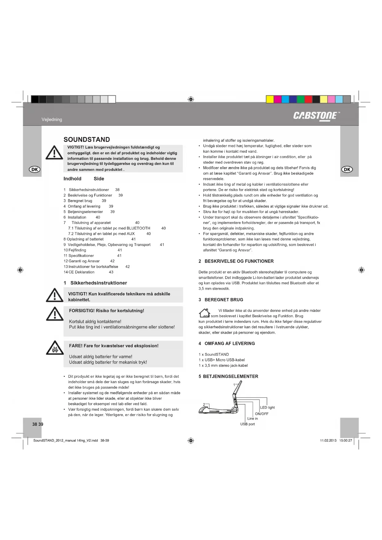 , som er et registreret mærkenavntilhørendeWentronicGmbH,atudstyretoverholderde europæiskeregulativersmindstekravogretningslinjer.Defremgår onlinepåadressenwww.cabstone.com.Allevaremærkerog registreredevaremærkertilhørerderesrespektiveejere. Vejledning SoundSTAND_2012_manual 14lng_V2.indd 42-43 11.02.2013 15:00:2844 45
