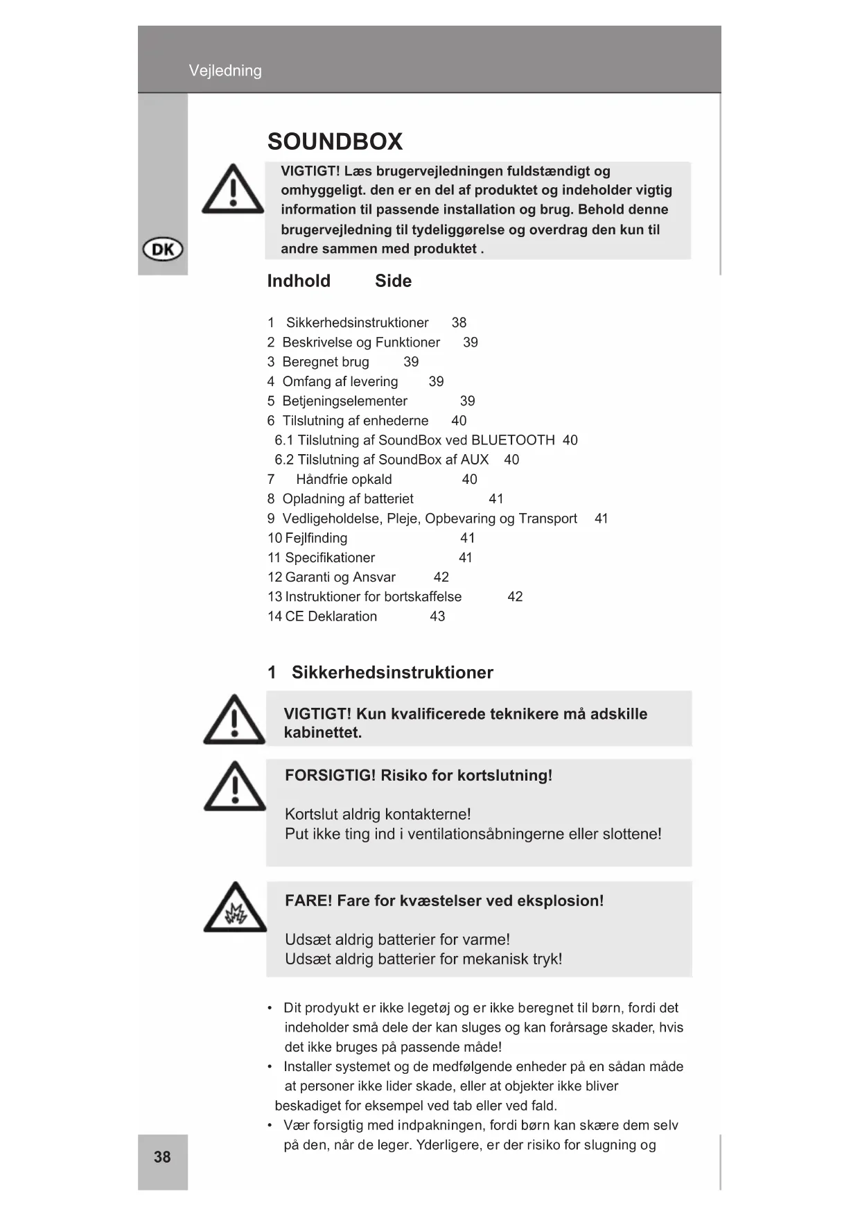 7 Håndfrieopkald 40 8 Opladning af batteriet 41 9Vedligeholdelse,Pleje,OpbevaringogTransport 41 10Fejlnding 41 11Specikationer 41 12 Garanti og Ansvar 42 13Instruktionerforbortskaffelse 42 14 CE Deklaration 43 1 Sikkerhedsinstruktioner VIGTIGT! Kun kvalicerede teknikere må adskille kabinettet.