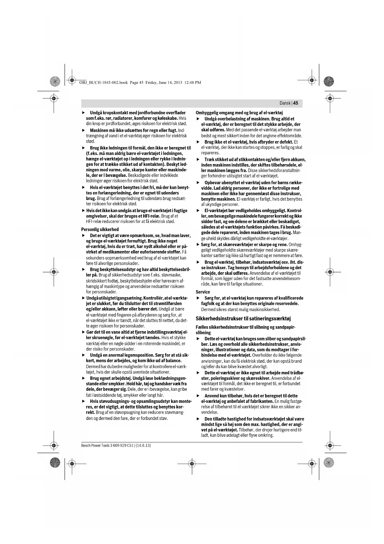 Combivlieswalsen Satineren en matschuren van metaaloppervlakken Fijn 120 –240 Vlieswalsen OBJ_BUCH-1845-002.book Page 43 Friday, June 14, 2013 12:48 PM44 | Dansk 3 609 929 C51 | (14.6.13) Bosch Power Tools Werk met een zo gering mogelijke aandrukkracht om de le- vensduur van het schuurmiddel te verhogen. Een overmatige verhoging van de aandrukkracht leidt niet tot een groter schuurvermogen, maar wel tot een sterkere slijtage van het elektrische gereedschap en het schuurmiddel. Werk met matige voorwaartse beweging en schuur met paral- lelle en overlappende schuurbanen. Voor het bereiken van een perfect oppervlak dient u bij de keuze van het schuurmiddel niet meer dan één korrelgrootte over te slaan. Gebruik uitsluitend origineel Bosch-schuurtoebehoren. Alleen onbeschadigde schuurmiddelen zorgen voor een goe- de schuurcapaciteit en ontzien het elektrische gereedschap. Span geen elektrische gereedschappen in de werkta- fel. Ingespannen elektrische gereedschappen en inzetge- reedschappen met scherpe randen kunnen ernstig letsel veroorzaken. Bewaren van schuurmiddelen Bewaar schuurmiddelen in de originele verpakking bij 15 °C – 25 °C kamertemperatuur en 40 % – 70 % lucht- vochtigheid. Bewaar schuurmiddelen niet op betonnen vloeren, in de buurt van open ramen of verwarmingen. Knik de schuurbanden niet, anders worden deze onbruikbaar. Onderhoud en service Onderhoud en reiniging Trek altijd voor werkzaamheden aan het elektrische gereedschap de stekker uit het stopcontact. Houd het elektrische gereedschap en de ventilatieope- ningen altijd schoon om goed en veilig te werken. Verwijder aanhechtend schuurstof met een kwast. Als de aansluitkabel moet worden vervangen, moeten deze werkzaamheden door Bosch of een erkende klantenservice voor Bosch elektrische gereedschappen worden uitgevoerd om veiligheidsrisico’s te voorkomen. Klantenservice en gebruiksadviezen Onze klantenservice beantwoordt uw vragen over reparatie en onderhoud van uw product en over vervangingsonderde- len. Explosietekeningen en informatie over vervangingson- derdelen vindt u ook op: www.bosch-pt.com Het Bosch-team voor gebruiksadviezen helpt u graag bij vra- gen over onze producten en toebehoren. Vermeld bij vragen en bestellingen van vervangingsonderde- len altijd het uit tien cijfers bestaande productnummer vol- gens het typeplaatje van het elektrische gereedschap. Nederland Tel.: (076) 579 54 54 Fax: (076) 579 54 94 E-mail: gereedschappen@nl.bosch.com België Tel.: (02) 588 0589 Fax: (02) 588 0595 E-mail: outillage.gereedschap@be.bosch.com Afvalverwijdering Elektrische gereedschappen, toebehoren en verpakkingen moeten op een voor het milieu verantwoorde wijze worden hergebruikt. Gooi elektrische gereedschappen niet bij het huisvuil. Alleen voor landen van de EU: Volgens de Europese richtlijn 2012/19/EU over elektrische en elektronische oude ap- paraten en de omzetting van de richtlijn in nationaal recht moeten niet meer bruikbare elektrische gereedschappen apart worden ingezameld en op een voor het milieu ver- antwoorde wijze worden hergebruikt. Wijzigingen voorbehouden. Dansk Sikkerhedsinstrukser Generelle sikkerhedsinstrukser til el-værktøj Læs alle sikkerhedsinstrukser og an- visninger. I tilfælde af manglende over- holdelse af sikkerhedsinstrukserne og anvisningerne er der ri- siko for elektrisk stød, brand og/eller alvorlige kvæstelser. Opbevar alle sikkerhedsinstrukser og anvisninger til se- nere brug. Det i sikkerhedsinstrukserne benyttede begreb „el-værktøj“ refererer til netdrevet el-værktøj (med netkabel) og akkudre- vet el-værktøj (uden netkabel). Sikkerhed på arbejdspladsen Sørg for, at arbejdsområdet er rent og rigtigt belyst. Uorden eller uoplyste arbejdsområder øger faren for uheld. Brug ikke el-værktøjet i eksplosionsfarlige omgivelser, hvor der findes brændbare væsker, gasser eller støv. El-værktøj kan slå gnister, der kan antænde støv eller dam- pe. Sørg for, at andre personer og ikke mindst børn holdes væk fra arbejdsområdet, når maskinen er i brug. Hvis man distraheres, kan man miste kontrollen over maskinen. Elektrisk sikkerhed El-værktøjets stik skal passe til kontakten. Stikket må under ingen omstændigheder ændres. Brug ikke adap- terstik sammen med jordforbundet el-værktøj. Uæn- drede stik, der passer til kontakterne, nedsætter risikoen for elektrisk stød. ADVARSEL OBJ_BUCH-1845-002.book Page 44 Friday, June 14, 2013 12:48 PMDansk | 45 Bosch Power Tools 3 609 929 C51 | (14.6.13) Undgå kropskontakt med jordforbundne overflader som f.eks. rør, radiatorer, komfurer og køleskabe. Hvis din krop er jordforbundet, øges risikoen for elektrisk stød. Maskinen må ikke udsættes for regn eller fugt. Ind- trængning af vand i et el-værktøj øger risikoen for elektrisk stød. Brug ikke ledningen til formål, den ikke er beregnet til (f.eks. må man aldrig bære el-værktøjet i ledningen, hænge el-værktøjet op i ledningen eller rykke i lednin- gen for at trække stikket ud af kontakten). Beskyt led- ningen mod varme, olie, skarpe kanter eller maskinde- le, der er i bevægelse. Beskadigede eller indviklede ledninger øger risikoen for elektrisk stød. Hvis el-værktøjet benyttes i det fri, må der kun benyt- tes en forlængerledning, der er egnet til udendørs brug. Brug af forlængerledning til udendørs brug nedsæt- ter risikoen for elektrisk stød. Hvis det ikke kan undgås at bruge el-værktøjet i fugtige omgivelser, skal der bruges et HFI-relæ. Brug af et HFI-relæ reducerer risikoen for at få elektrisk stød. Personlig sikkerhed Det er vigtigt at være opmærksom, se, hvad man laver, og bruge el-værktøjet fornuftigt. Brug ikke noget el-værktøj, hvis du er træt, har nydt alkohol eller er på- virket af medikamenter eller euforiserende stoffer. Få sekunders uopmærksomhed ved brug af el-værktøjet kan føre til alvorlige personskader. Brug beskyttelsesudstyr og hav altid beskyttelsesbril- ler på. Brug af sikkerhedsudstyr som f.eks. st