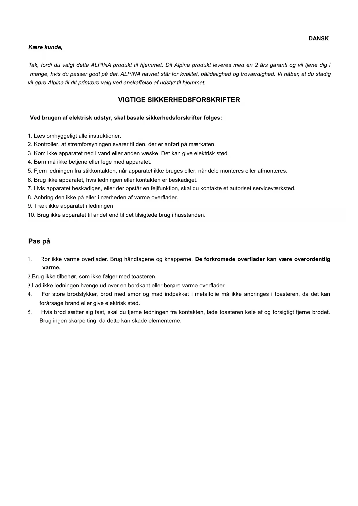 SF 2506 - Brødrister ALPINA - Gratis brugsanvisning og manual