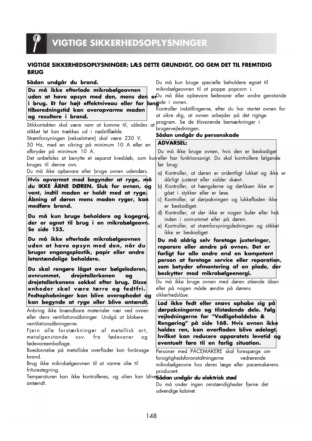 VIGTIGE SIKKERHEDSOPLYSNINGER VIGTIGE SIKKERHEDSOPLYSNINGER: LÆS DETTE GRUNDIGT, OG GEM DET TIL FREMTIDIG BRUG Du må kun bruge specielle beholdere egnet til mikrobølgeovnen til at poppe popcorn i. Du må ikke opbevare fødevarer eller andre genstande inde i ovnen. Kontroller indstillingerne, efter du har startet ovnen for at sikre dig, at ovnen arbejder på det rigtige program. Se de tilsvarende bemærkninger i brugervejledningen. Sådan undgår du personskade ADVARSEL: Du må ikke bruge ovnen, hvis den er beskadiget eller har funktionssvigt. Du skal kontrollere følgende før brug: a) Kontroller, at døren er ordentligt lukket og ikke er dårligt justeret eller sidder skævt. b) Kontroller, at hængslerne og dørlåsen ikke er gået i stykker eller er løse. c) Kontroller, at dørpakningen og lukkefladen ikke er beskadiget. d) Kontroller, at der ikke er nogen buler eller hak inden i ovnrummet eller på døren. e) Kontroller, at strømforsyningsledningen og stikket ikke er beskadiget Du må aldrig selv foretage justeringer, reparere eller ændre på ovnen. Det er farligt for alle andre end en kompetent person at foretage service eller reparation, som betyder afmontering af en plade, der beskytter mod mikrobølgeenergi. Du må ikke bruge ovnen med døren stående åben eller på nogen måde ændre på dørens sikkerhedslåse. Lad ikke fedt eller snavs ophobe sig på dørpakningerne og tilstødende dele. Følg vejledningerne for "Vedligeholdelse & Rengøring" på side 168. Hvis ovnen ikke holdes ren, kan overfladen blive ødelagt, hvilket kan reducere apparatets levetid og eventuelt føre til en farlig situation. Personer med PACEMAKERE skal forespørge om forsigtighedsforanstaltningerne vedrørende mikrobølgeovne hos deres læge eller pacemakerens producent. Sådan undgår du elektrisk stød Du må under ingen omstændigheder fjerne det udvendige kabinet. Sådan undgår du brand. Du må ikke efterlade mikrobølgeovnen uden at have opsyn med den, mens den er i brug. Et for højt effektniveau eller for lang tilberedningstid kan overopvarme maden og resultere i brand. Stikkontakten skal være nem at komme til, således at stikket let kan trækkes ud i nødstilfælde. Strømforsyningen (vekselstrøm) skal være 230 V, 50 Hz, med en sikring på minimum 10 A eller en afbryder på minimum 10 A. Det anbefales at benytte et separat kredsløb, som kun bruges til denne ovn. Du må ikke opbevare eller bruge ovnen udendørs. Hvis opvarmet mad begynder at ryge, må du IKKE ÅBNE DØREN. Sluk for ovnen, og vent, indtil maden er holdt med at ryge. Åbning af døren mens maden ryger, kan medføre brand. Du må kun bruge beholdere og kogegrej, der er egnet til brug i en mikrobølgeovn. Se side 155. Du må ikke efterlade mikrobølgeovnen uden at have opsyn med den, når du bruger engangsplastik, papir eller andre letantændelige beholdere. Du skal rengøre låget over bølgelederen, ovnrummet, drejetallerkenen og drejetallerkenens sokkel efter brug. Disse enheder skal være tørre og fedtfri. Fedtophobninger kan blive overophedet og kan begynde at ryge eller blive antændt. Anbring ikke brændbare materialer nær ved ovnen eller dens ventilationsåbninger. Undgå at blokere ventilationsåbningerne. Fjern alle forstærkninger af metallisk art, metalgenstande osv. fra fødevarer og fødevareemballage. Buedannelse på metalliske overflader kan forårsage brand. Brug ikke mikrobølgeovnen til at varme olie til friturestegning. Temperaturen kan ikke kontrolleres, og olien kan blive antændt.149 VIGTIGE SIKKERHEDSOPLYSNINGER DANSK Du må aldrig spilde væske ind i eller placere genstande i dørlåsens eller ventilationens åbninger. Hvis du har spildt væske, skal du straks slukke for ovnen, trække stikket ud og ringe til en autoriseret servicemedarbejder hos ELECTROLUX. Du må ikke dyppe strømforsyningsledningen eller stikket i vand eller anden væske. Du må ikke føre strømforsyningsledningen hen over en varm eller skarp overflade såsom området omkring varmluftshullet øverst på ovnens bagside. Du må ikke forsøge selv at udskifte ovnlyset eller lade nogen anden end en autoriseret ELECTROLUX servicemedarbejder gøre det. Hvis ovnlyset ikke fungerer, skal du kontakte din forhandler eller en autoriseret servicemedarbejder hos ELECTROLUX. Hvis mikrobølgeovnens strømforsyningsledning beskadiges, skal den erstattes af en speciel ledning. Denne udskiftning skal foretages af en autoriseret ELECTROLUX servicemedarbejder. Sådan undgår du risiko for eksplosion og pludselig kogning: ADVARSEL: Væske og andre fødevarer må ikke opvarmes i lukkede beholdere, da der er risiko for, at de eksploderer. Brug aldrig lukkede beholdere. Fjern forsegling og låg før brug. Forseglede beholdere kan eksplodere på grund af et opbygget tryk, selv efter at ovnen er slukket. Pas på, når du opvarmer drikkevarer i mikrobølgeovnen. Brug en beholder med en bred åbning, så boblerne slipper ud. Opvarmning af drikkevarer i mikrobølgeovnen kan resultere i forsinket kraftig kogning, og det er derfor vigtigt at være forsigtig, når du håndterer beholderen. Sådan undgår du pludselig kraftig kogning og skoldning:
