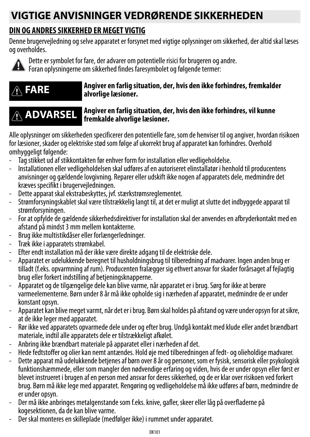 DIN OG ANDRES SIKKERHED ER MEGET VIGTIG Denne brugervejledning og selve apparatet er forsynet med vigtige oplysninger om sikkerhed, der altid skal læses og overholdes. Dette er symbolet for fare, der advarer om potentielle risici for brugeren og andre. Foran oplysningerne om sikkerhed findes faresymbolet og følgende termer: FARE Angiver en farlig situation, der, hvis den ikke forhindres, fremkalder alvorlige læsioner. ADVARSEL Angiver en farlig situation, der, hvis den ikke forhindres, vil kunne fremkalde alvorlige læsioner. Alle oplysninger om sikkerheden specificerer den potentielle fare, som de henviser til og angiver, hvordan risikoen for læsioner, skader og elektriske stød som følge af ukorrekt brug af apparatet kan forhindres. Overhold omhyggeligt følgende: - Tag stikket ud af stikkontakten før enhver form for installation eller vedligeholdelse. - Installationen eller vedligeholdelsen skal udføres af en autoriseret elinstallatør i henhold til producentens anvisninger og gældende lovgivning. Reparer eller udskift ikke nogen af apparatets dele, medmindre det kræves specifikt i brugervejledningen. - Dette apparat skal ekstrabeskyttes, jvf. stærkstrømsreglementet. - Strømforsyningskablet skal være tilstrækkelig langt til, at det er muligt at slutte det indbyggede apparat til strømforsyningen. - For at opfylde de gældende sikkerhedsdirektiver for installation skal der anvendes en afbryderkontakt med en afstand på mindst 3 mm mellem kontakterne. - Brug ikke multistikdåser eller forlængerledninger. - Træk ikke i apparatets strømkabel. - Efter endt installation må der ikke være direkte adgang til de elektriske dele. - Apparatet er udelukkende beregnet til husholdningsbrug til tilberedning af madvarer. Ingen anden brug er tilladt (f.eks. opvarmning af rum). Producenten fralægger sig ethvert ansvar for skader forårsaget af fejlagtig brug eller forkert indstilling af betjeningsknapperne. - Apparatet og de tilgængelige dele kan blive varme, når apparatet er i brug. Sørg for ikke at berøre varmeelementerne. Børn under 8 år må ikke opholde sig i nærheden af apparatet, medmindre de er under konstant opsyn. - Apparatet kan blive meget varmt, når det er i brug. Børn skal holdes på afstand og være under opsyn for at sikre, at de ikke leger med apparatet. - Rør ikke ved apparatets opvarmede dele under og efter brug. Undgå kontakt med klude eller andet brændbart materiale, indtil alle apparatets dele er tilstrækkeligt afkølet. - Anbring ikke brændbart materiale på apparatet eller i nærheden af det. - Hede fedtstoffer og olier kan nemt antændes. Hold øje med tilberedningen af fedt- og olieholdige madvarer. - Dette apparat må udelukkende betjenes af børn over 8 år og personer, som er fysisk, sensorisk eller psykologisk funktionshæmmede, eller som mangler den nødvendige erfaring og viden, hvis de er under opsyn eller først er blevet instrueret i brugen af en person med ansvar for deres sikkerhed, og de er klar over risikoen ved forkert brug. Børn må ikke lege med apparatet. Rengøring og vedligeholdelse må ikke udføres af børn, medmindre de er under opsyn. - Der må ikke anbringes metalgenstande som f.eks. knive, gafler, skeer eller låg på overfladerne på kogesektionen, da de kan blive varme. - Der skal monteres en skilleplade (medfølger ikke) i rummet under apparatet. DK101 - Hvis der er en revne i overfladen, skal stikket tages ud af stikkontakten for at undgå risikoen for elektrisk stød. - Apparatet er ikke beregnet til at blive startet ved hjælp af en ekstern timer eller en separat fjernbetjening. - ADVARSEL: Hold øje med kogesektionen, når der tilberedes med fedtstoffer eller olie, da de kan komme i brand. Forsøg ALDRIG at slukke en brand med vand, men tag stikket ud af stikkontakten, og dæk derefter flammen til med for eksempel et låg eller et brandtæppe. ADVARSEL: Risiko for brand: opbevar ikke genstande på kogezonernes overflader. - Anvend ikke damprensere. - Der må ikke anbringes genstande af metal, som f.eks. knive, gafler, skeer og låg, på kogesektionens overflade. De kan blive meget varme. - Efter endt tilberedning skal der slukkes for kogezonen ved hjælp af den tilhørende betjeningsknap. Stol ikke på grydedetektoren. DK102