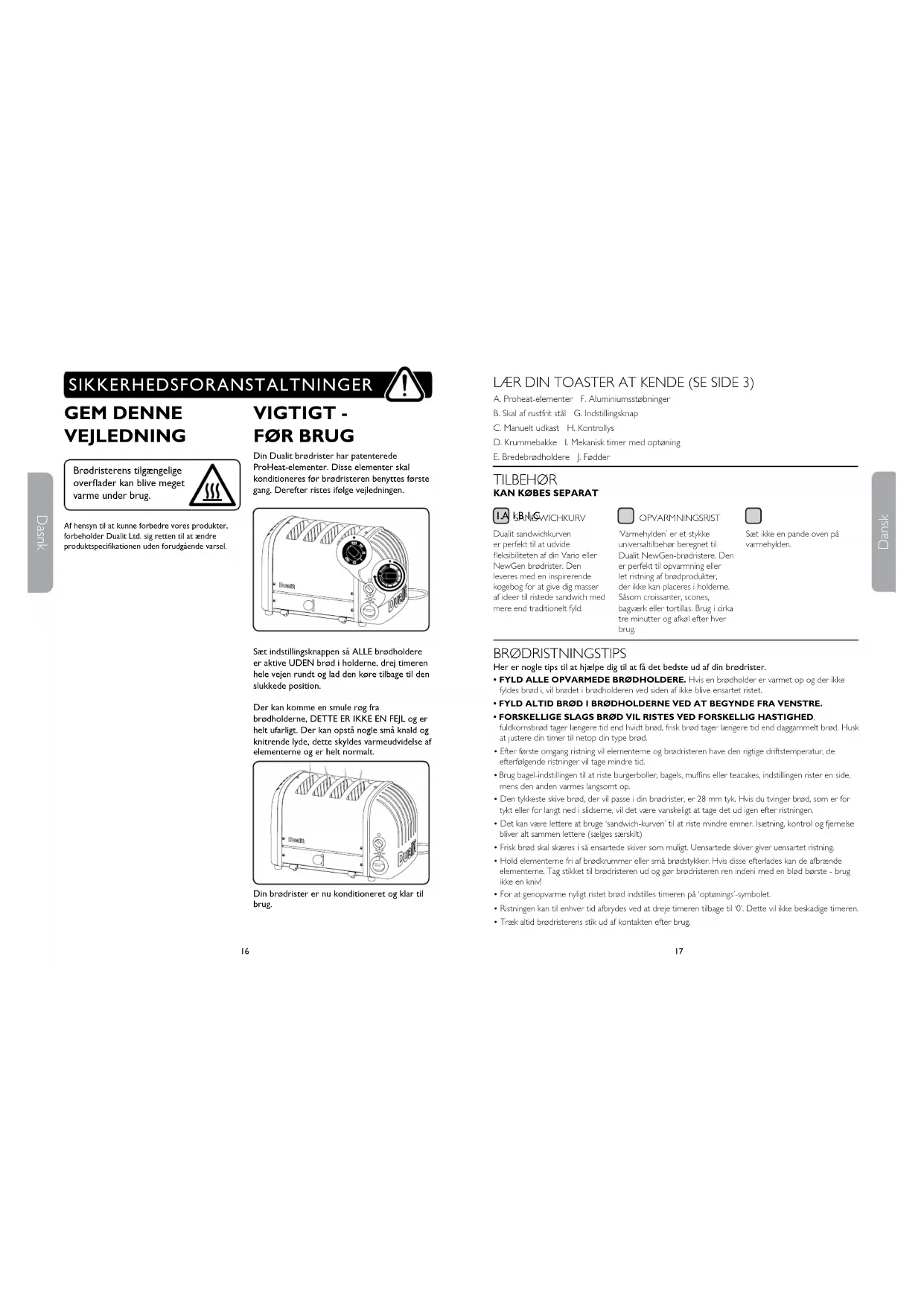 - Brug bagel-indstillingen til at riste burgerboller, bagels, mufns eller teacakes, indstillingen rister en side, mens den anden varmes langsomt op.• Den tykkeste skive brød, der vil passe i din brødrister, er 28 mm tyk. Hvis du tvinger brød, som er for tykt eller for langt ned i slidserne, vil det være vanskeligt at tage det ud igen efter ristningen.• Det kan være lettere at bruge ‘sandwich-kurven’ til at riste mindre emner. Isætning, kontrol og fjernelse bliver alt sammen lettere (sælges særskilt)• Frisk brød skal skæres i så ensartede skiver som muligt. Uensartede skiver giver uensartet ristning. • Hold elementerne fri af brødkrummer eller små brødstykker. Hvis disse efterlades kan de afbrænde elementerne. Tag stikket til brødristeren ud og gør brødristeren ren indeni med en blød børste - brug ikke en kniv!• For at genopvarme nyligt ristet brød indstilles timeren på ‘optønings’-symbolet.• Ristningen kan til enhver tid afbrydes ved at dreje timeren tilbage til ‘0’. Dette vil ikke beskadige timeren.• Træk altid brødristerens stik ud af kontakten efter brug. SANDWICHKURV Dualit sandwichkurven er perfekt til at udvide eksibiliteten af din Vario eller NewGen brødrister. Den leveres med en inspirerende kogebog for at give dig masser af ideer til ristede sandwich med mere end traditionelt fyld. OPVARMNINGSRIST ‘Varmehylden’ er et stykke universaltilbehør beregnet til Dualit NewGen-brødristere. Den er perfekt til opvarmning eller let ristning af brødprodukter, der ikke kan placeres i holderne. Såsom croissanter, scones, bagværk eller tortillas. Brug i cirka tre minutter og afkøl efter hver brug.Sæt ikke en pande oven på varmehylden. 1.A 1.B 1.C A. Proheat-elementer F. Aluminiumsstøbninger B. Skal af rustfrit stål G. Indstillingsknap C. Manuelt udkast H. Kontrollys D. Krummebakke I. Mekanisk timer med optøning E. Bredebrødholdere J. Fødder SIKKERHEDSFORANSTALTNINGER1918 Dansk Dasnk