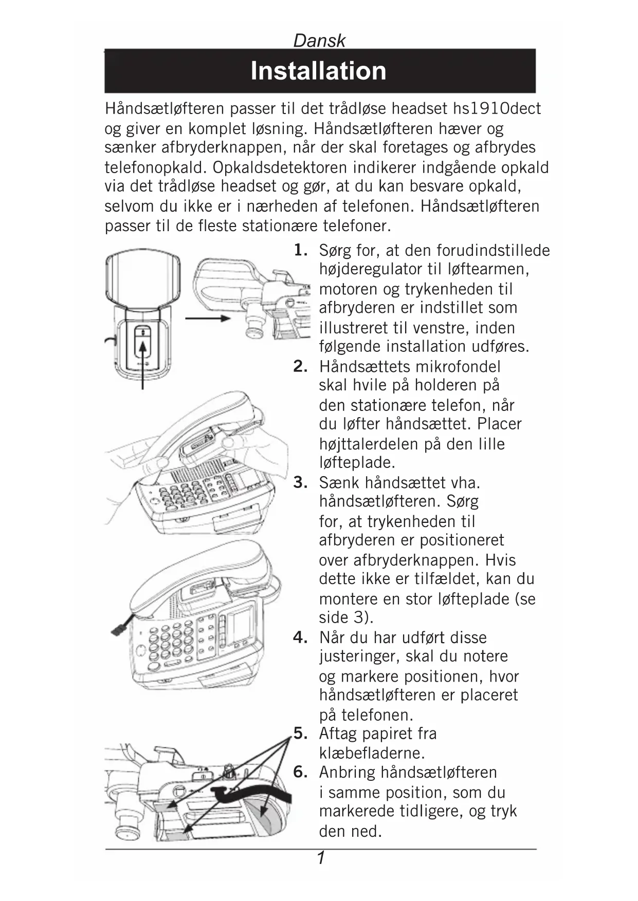 Håndsætløfteren passer til det trådløse headset hs1910duct og giver en komplet lösning. Håndsætløfteren hæver og sænker afbryderknappen,ningar der skal foretages og afbrydest Telefonopkald. Opkaldsdetektoren indikerer indgående opkald via det trådløse headset og gør, at du kan besvare opkald, selvom du ikke er iærheden af Telefonen. Håndsætløfteren passer til de feste stationære Telefoner.