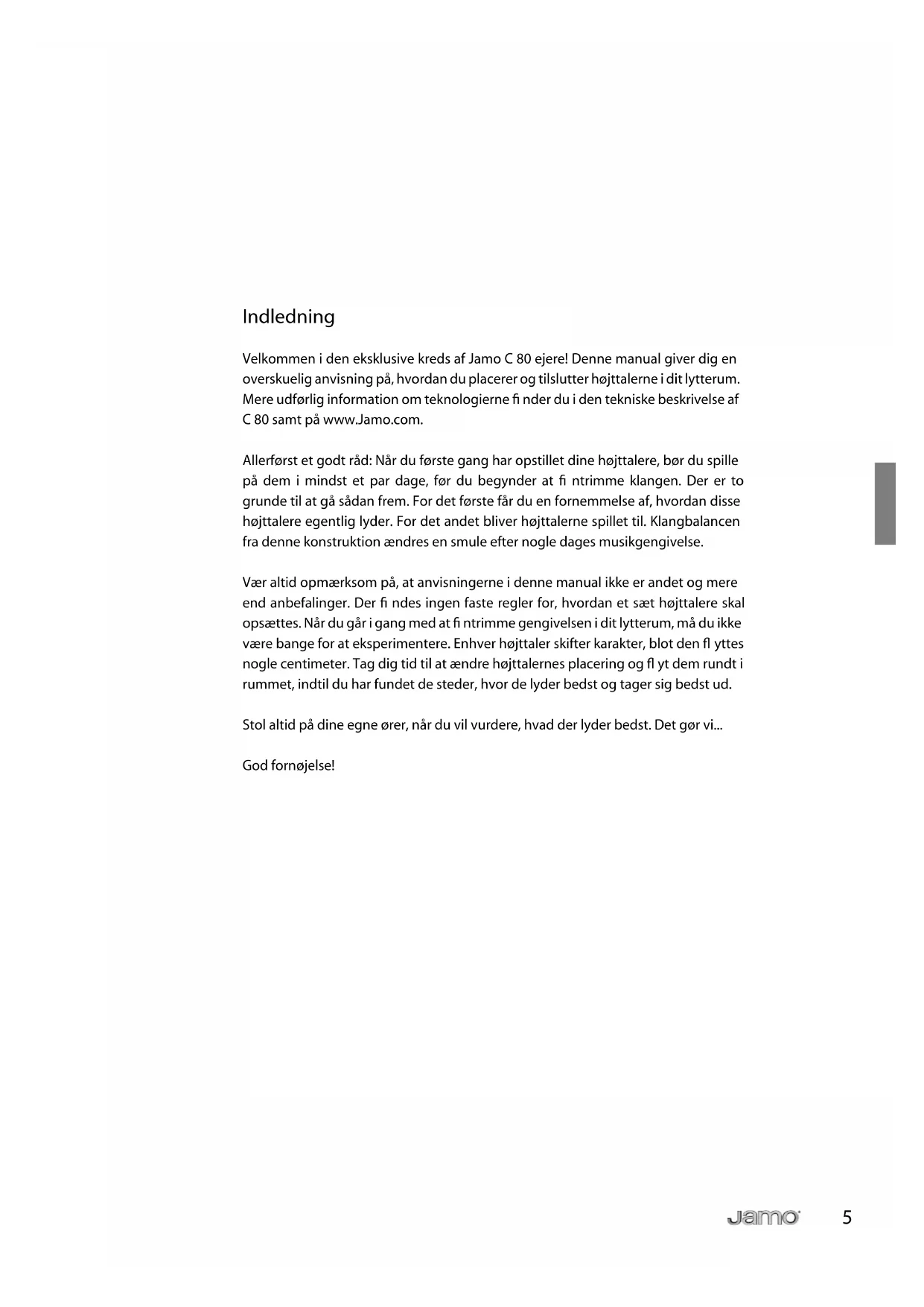 - Jamo consumer warranty dansk5 Indledning Velkommen i den eksklusive kreds af Jamo C 80 ejere! Denne manual giver dig en overskuelig anvisning på, hvordan du placerer og tilslutter højttalerne i dit lytterum. Mere udførlig information om teknologierne fi nder du i den tekniske beskrivelse af C 80 samt på www.Jamo.com. Allerførst et godt råd: Når du første gang har opstillet dine højttalere, bør du spille på dem i mindst et par dage, før du begynder at fi ntrimme klangen. Der er to grunde til at gå sådan frem. For det første får du en fornemmelse af, hvordan disse højttalere egentlig lyder. For det andet bliver højttalerne spillet til. Klangbalancen fra denne konstruktion ændres en smule efter nogle dages musikgengivelse. Vær altid opmærksom på, at anvisningerne i denne manual ikke er andet og mere end anbefalinger. Der fi ndes ingen faste regler for, hvordan et sæt højttalere skal opsættes. Når du går i gang med at fi ntrimme gengivelsen i dit lytterum, må du ikke være bange for at eksperimentere. Enhver højttaler skifter karakter, blot den fl yttes nogle centimeter. Tag dig tid til at ændre højttalernes placering og fl yt dem rundt i rummet, indtil du har fundet de steder, hvor de lyder bedst og tager sig bedst ud. Stol altid på dine egne ører, når du vil vurdere, hvad der lyder bedst. Det gør vi God fornøjelse!6 Generelle råd om opsætning af højttalere Stereo-trekanten Du kan bruge den såkaldte stereo-trekant som udgangspunkt for placeringen af dine højttalere. Afstanden mellem højttalerne bør være den samme som afstanden fra din lytteposition til begge højttalere. Med andre ord en ligesidet trekant. Dæmpning Hvis dit lytterum A) ikke giver dig mulighed for at stille højttalerne i de anbefalede afstande fra bag- og sidevæggene, eller B) har stærkt refl ekterende fl ader, f.eks. vinduer og nøgne vægge af mursten eller beton, eller C) bare ikke lyder helt rigtigt, p. 21