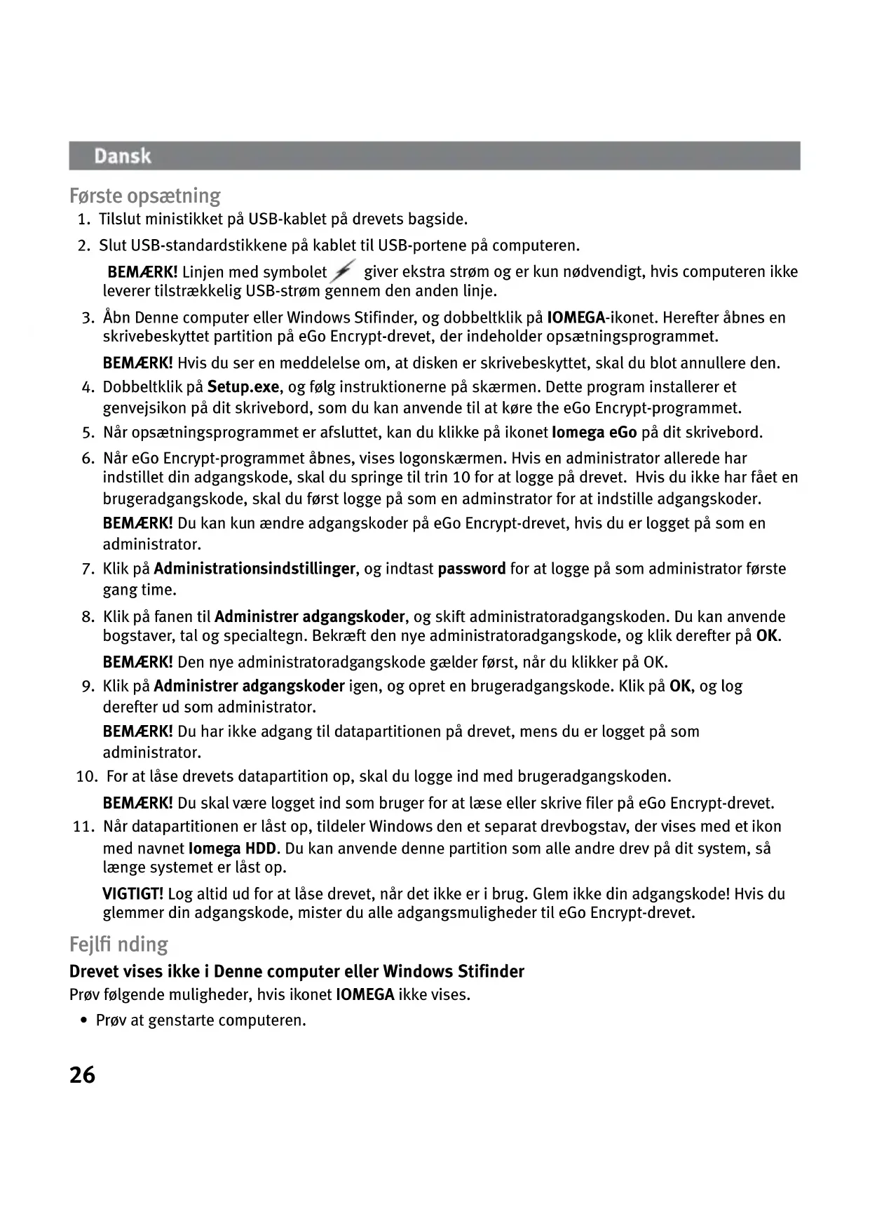 - Prøv at ændre kabeltilslutningerne til andre USB-porte på computeren. Hvis ikonet IOMEGA vises, men der ikke er noget ikon for Iomega HDD datapartitionen: Dobbeltklik på ikonet Iomega eGo på skrivebordet, og indtast adgangskoden for at låse drevet op. Iomega HDD- partitionen er kun synlig, når du er logget på som bruger. Brug af drevet Brugeradgang Når du er logget ind som bruger, har du adgang til Iomega HDD-datapartitionen på eGo Encrypt-drevet. På denne måde kan du vise, ændre, og oprette filer på datapartitionen. Brugerlogin giver ikke adgang til at ændre adgangskoder eller sikker sletning af drevet. Log altid ud, når drevet ikke anvendes, for at beskytte dine datas sikkerhed. Hvis du vil koble fra USB: Log først ud, og brug så operativsystemets mulighed for sikker fjernelse af hardware. ADVARSEL! Du må ikke frakoble drevet under dataoverførsel, hvis du vil undgå tab af data (aktivitetsindikatoren blinker). Administratoradgang Drevadministratoren kan indstille eller ændre både administrator- og brugeradgangskoder. Administratoren kan også udføre en sikker sletning, der ødelægger alle data, der er gemt på drevet. Administratorlogin giver ikke adgang til drevets datapartition. Sikker sletning Sikker sletning er en ikke-gendannelig fremgangsmåde, der ødelægger alle data, der er gemt på Iomega HDD-datapartitionen. Du skal være logget ind som administrator for at udføre en sikker sletning. Når du har udført en sikker sletning, skal du formatere datapartitionen med et NTFS-filsystem. Du skal logge ud som administrator og logge ind som bruger for at kunne formatere datapartitionen. Begrænset garanti Kunder, der registrerer deres nye produkter på www.iomegareg.com maks. 90 dage efter købet, vil få en forlænget garanti, så den samlede garantiperiode bliver tre (3) år i alle regioner. BEMÆRK: Du skal registrere med et tilgængeligt sprog. Forlængelse af garantiperioden gælder ikke for istandsatte produkter. Besøg www.iomega.com/support for at se en komplet beskrivelse af garantibetingelserne. Førstegangs oppsett
