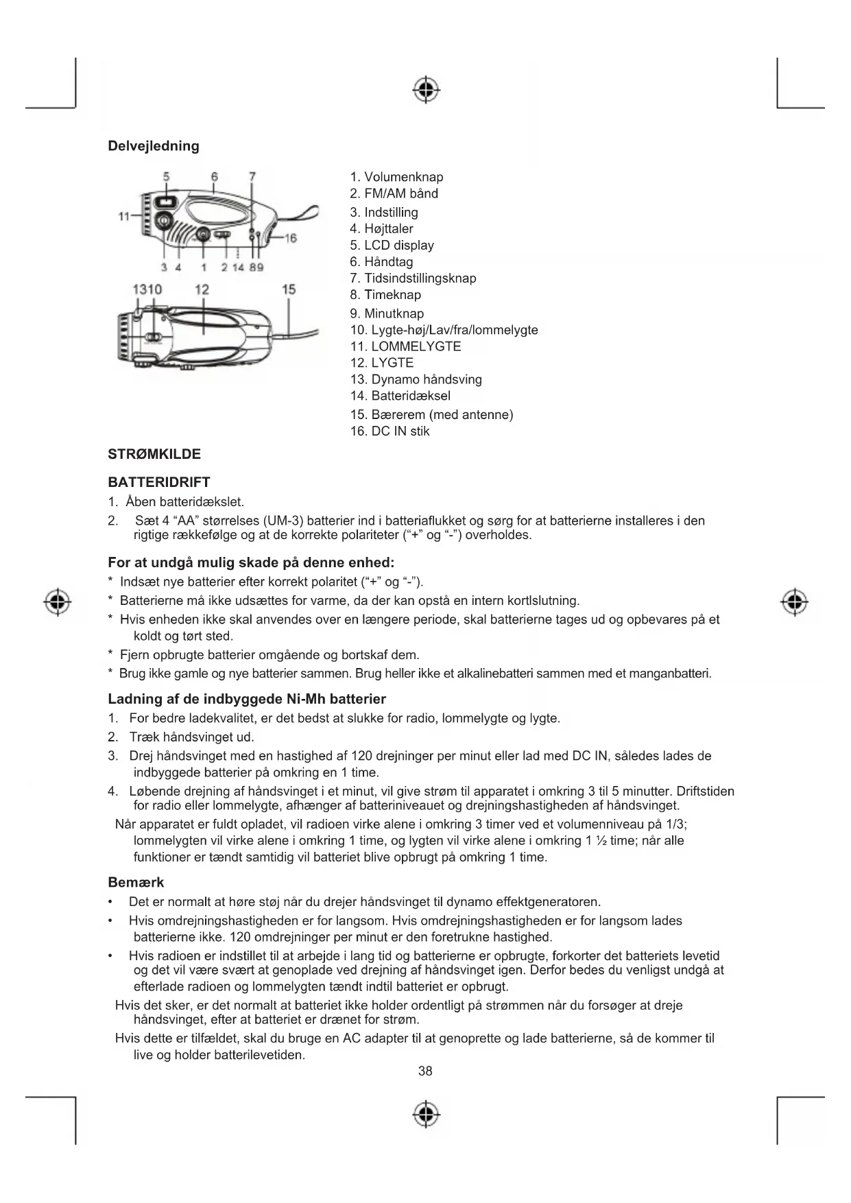 for radio eller lommelygte, afhænger af batteriniveauet og drejningshastigheden af håndsvinget. Når apparatet er fuldt opladet, vil radioen virke alene i omkring 3 timer ved et volumenniveau på 1/3; lommelygten vil virke alene i omkring 1 time, og lygten vil virke alene i omkring 1 ½ time; når alle funktioner er tændt samtidig vil batteriet blive opbrugt på omkring 1 time. Bemærk