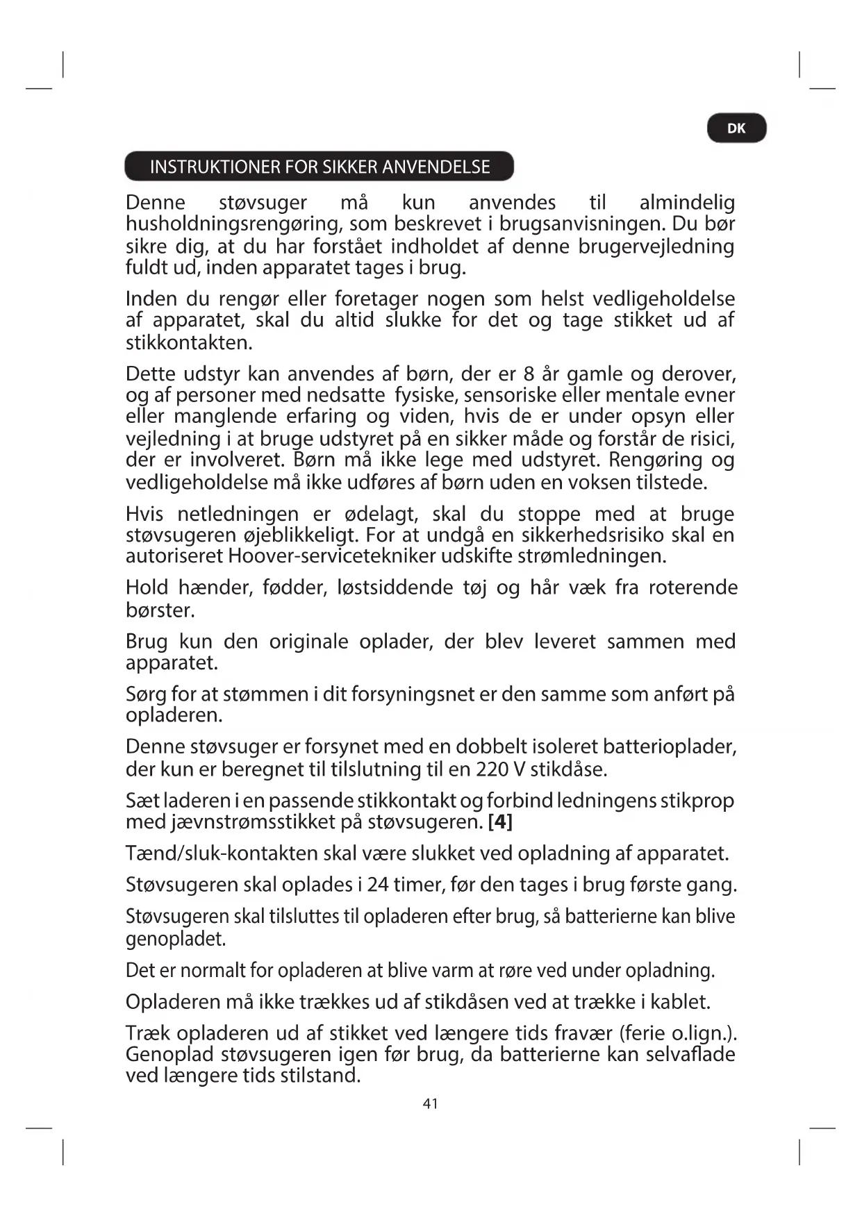 INSTRUKTIONER FOR SIKKER ANVENDELSE Denne støvsuger må kun anvendes til almindelig