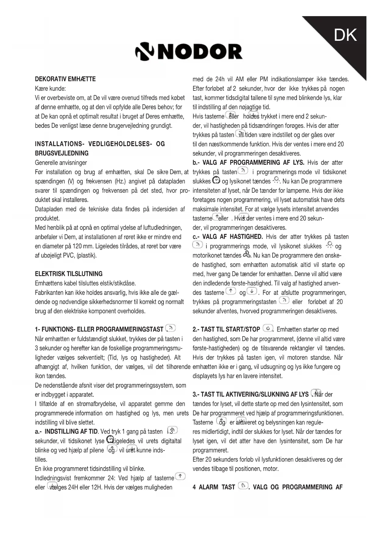 FABRIKANTEN FRALÆGGER SIG ALT ANSVAR I TILFÆLDE AF, AT ALLE DE BESKREVNE ANGIVELSER TIL KORREKT INSTALLATION, VEDLIGEHOLDELSE OG BRUG AF EMHÆTTEN IKKE ER BLEVET OVERHOLDT.