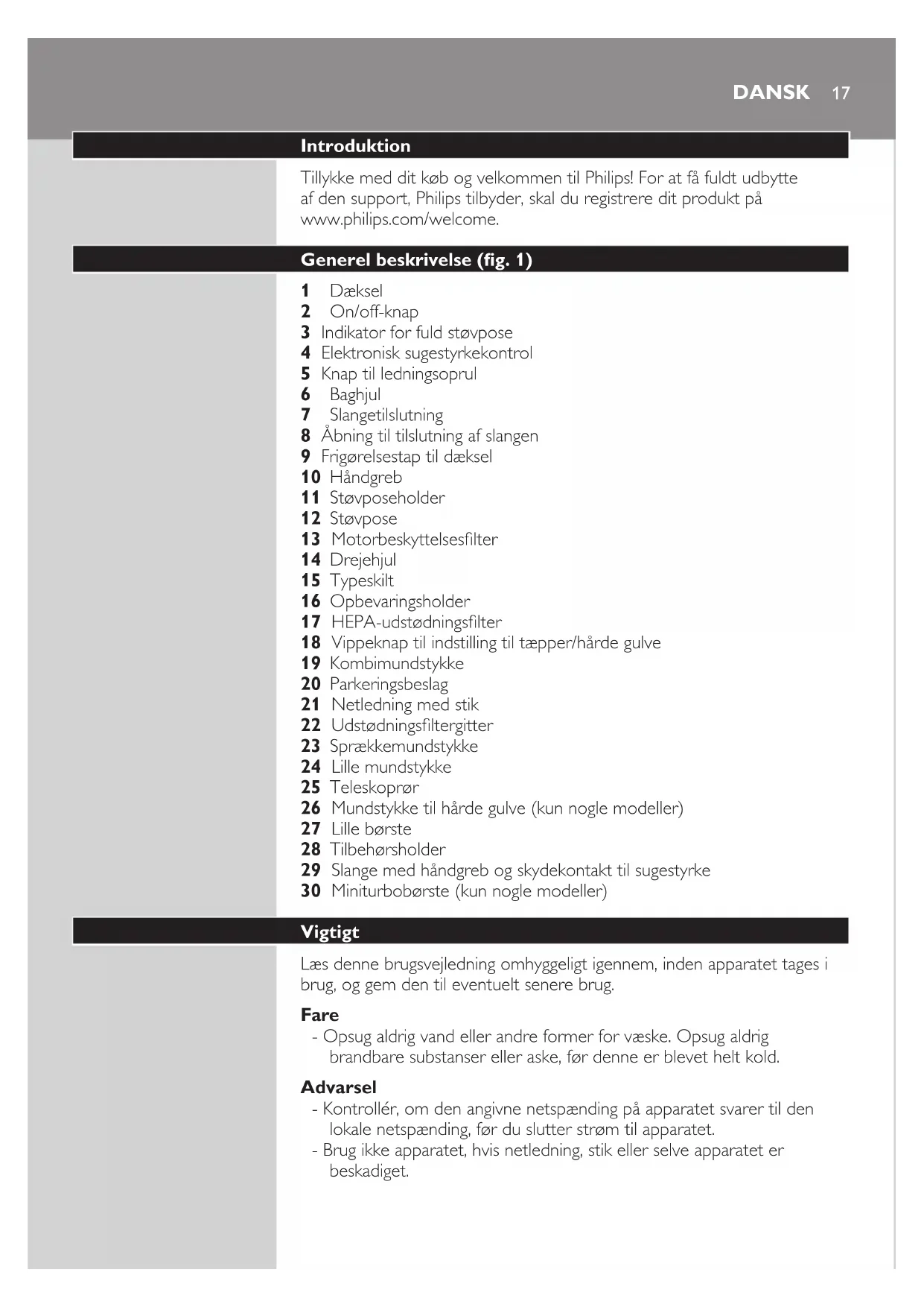 DANSK- Hvis netledningen beskadiges, må den kun udskiftes af Philips, et
