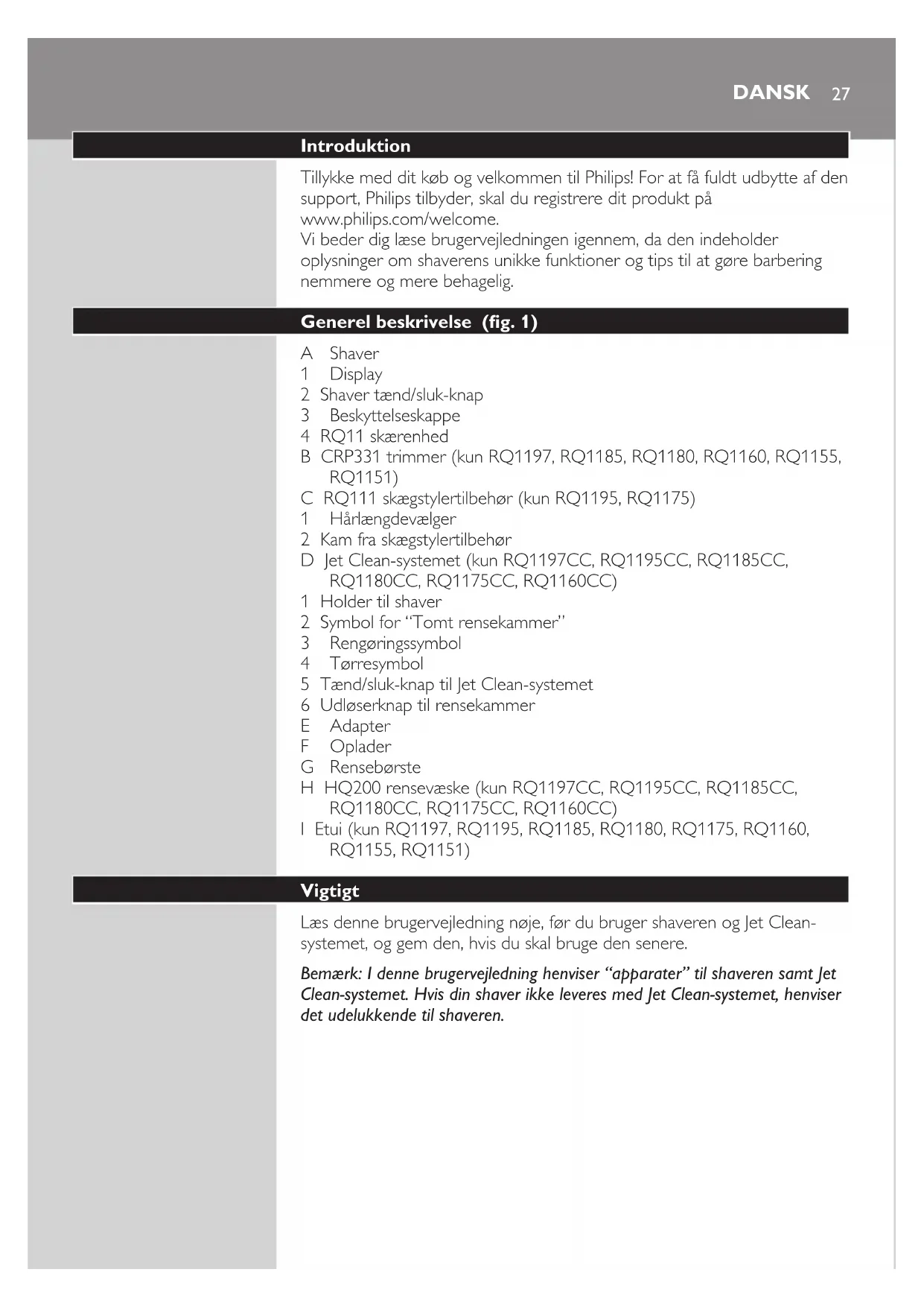 Læs denne brugervejledning nøje, før du bruger shaveren og Jet Clean-