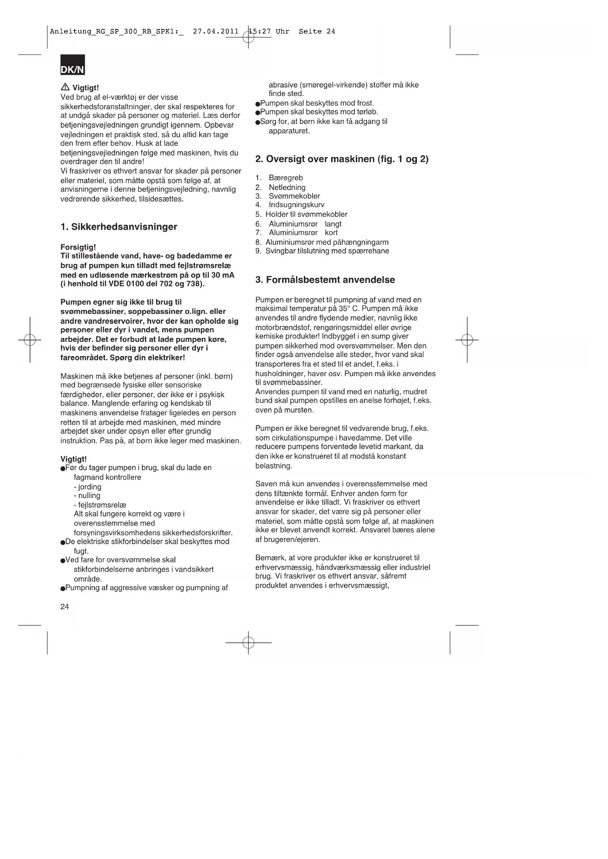 brug af pumpen kun tilladt med fejlstrømsrelæ