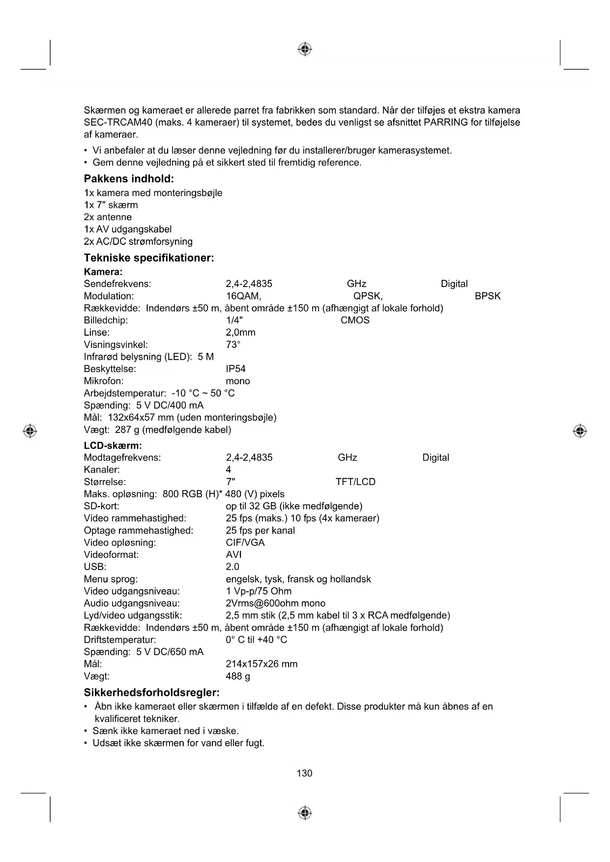 Sendefrekvens: 2,4-2,4835 GHz Digital Modulation: 16QAM, QPSK, BPSK Rækkevidde: Indendors ± 50m abent omrade ± 150m (afhengigt af lokale forhold) Billedchip: 1 / 4'' CMOS