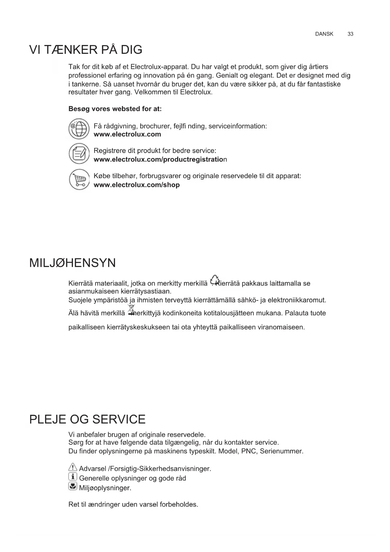 DANSK VI TÆNKER PÅ DIG Tak for dit køb af et Electrolux-apparat. Du har valgt et produkt, som giver dig årtiers