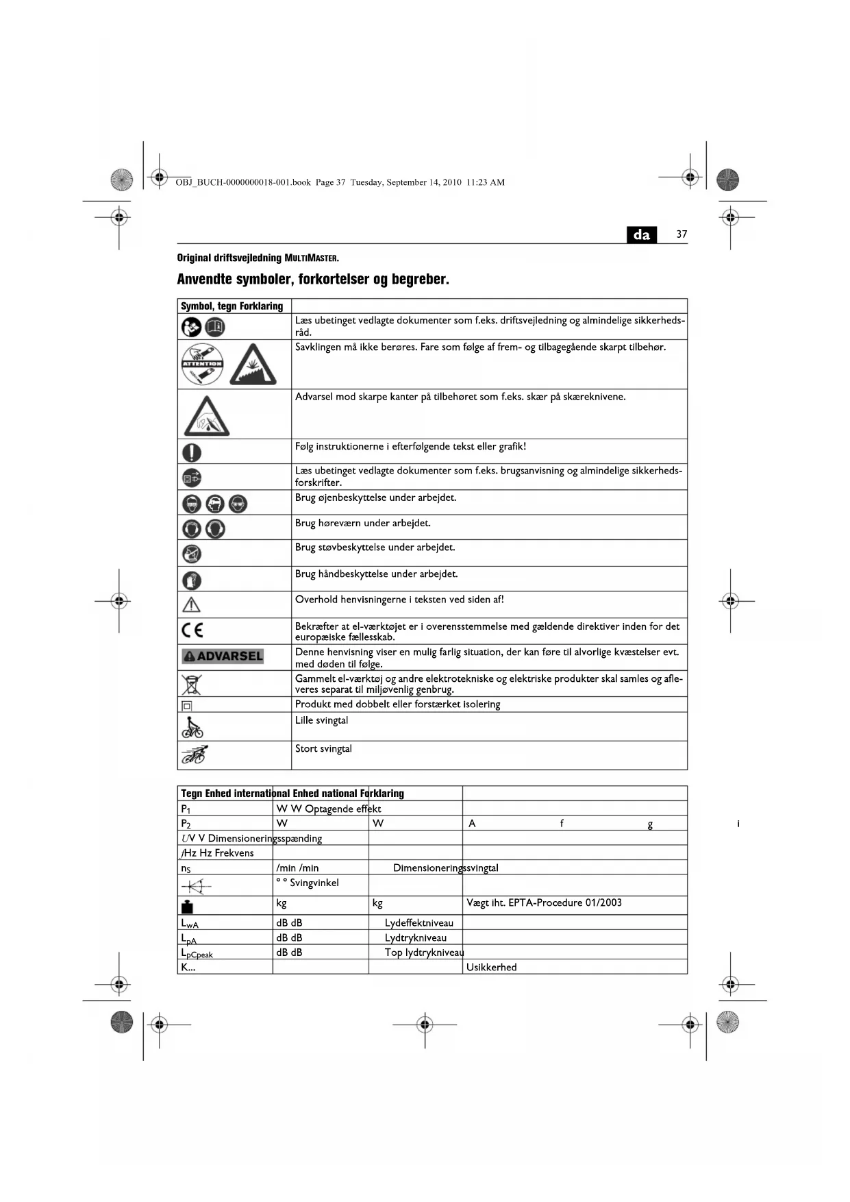 Original driftsvejledning MULTIMASTER. Anvendte symboler, forkortelser og begreber. Symbol, tegn Forklaring Læs ubetinget vedlagte dokumenter som f.eks. driftsvejledning og almindelige sikkerheds- råd. Savklingen må ikke berøres. Fare som følge af frem- og tilbagegående skarpt tilbehør. Advarsel mod skarpe kanter på tilbehøret som f.eks. skær på skæreknivene. Følg instruktionerne i efterfølgende tekst eller grafik! Læs ubetinget vedlagte dokumenter som f.eks. brugsanvisning og almindelige sikkerheds- forskrifter. Brug øjenbeskyttelse under arbejdet. Brug høreværn under arbejdet. Brug støvbeskyttelse under arbejdet. Brug håndbeskyttelse under arbejdet. Overhold henvisningerne i teksten ved siden af! Bekræfter at el-værktøjet er i overensstemmelse med gældende direktiver inden for det europæiske fællesskab. Denne henvisning viser en mulig farlig situation, der kan føre til alvorlige kvæstelser evt. med døden til følge. Gammelt el-værktøj og andre elektrotekniske og elektriske produkter skal samles og afle- veres separat til miljøvenlig genbrug. Produkt med dobbelt eller forstærket isolering Lille svingtal Stort svingtal Tegn Enhed international Enhed national Forklaring