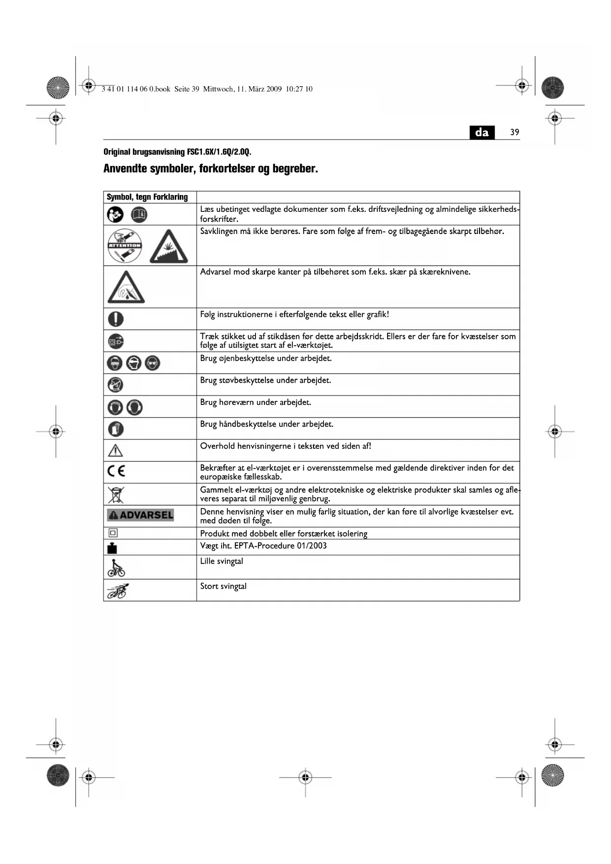 | Gammelt el-værktøj og andre elektrrotekniske og elektriskeprodukter skal samles og afléveres separat til miljøvenlig genbrug. | |