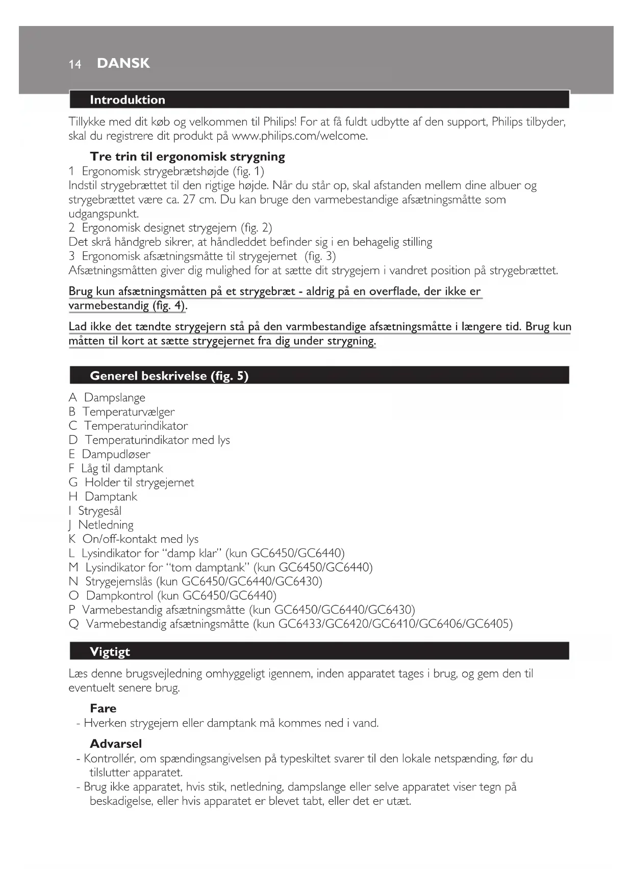 - Hvis ledningen eller dampslangen beskadiges, må de kun udskiftes af Philips, et autoriseret