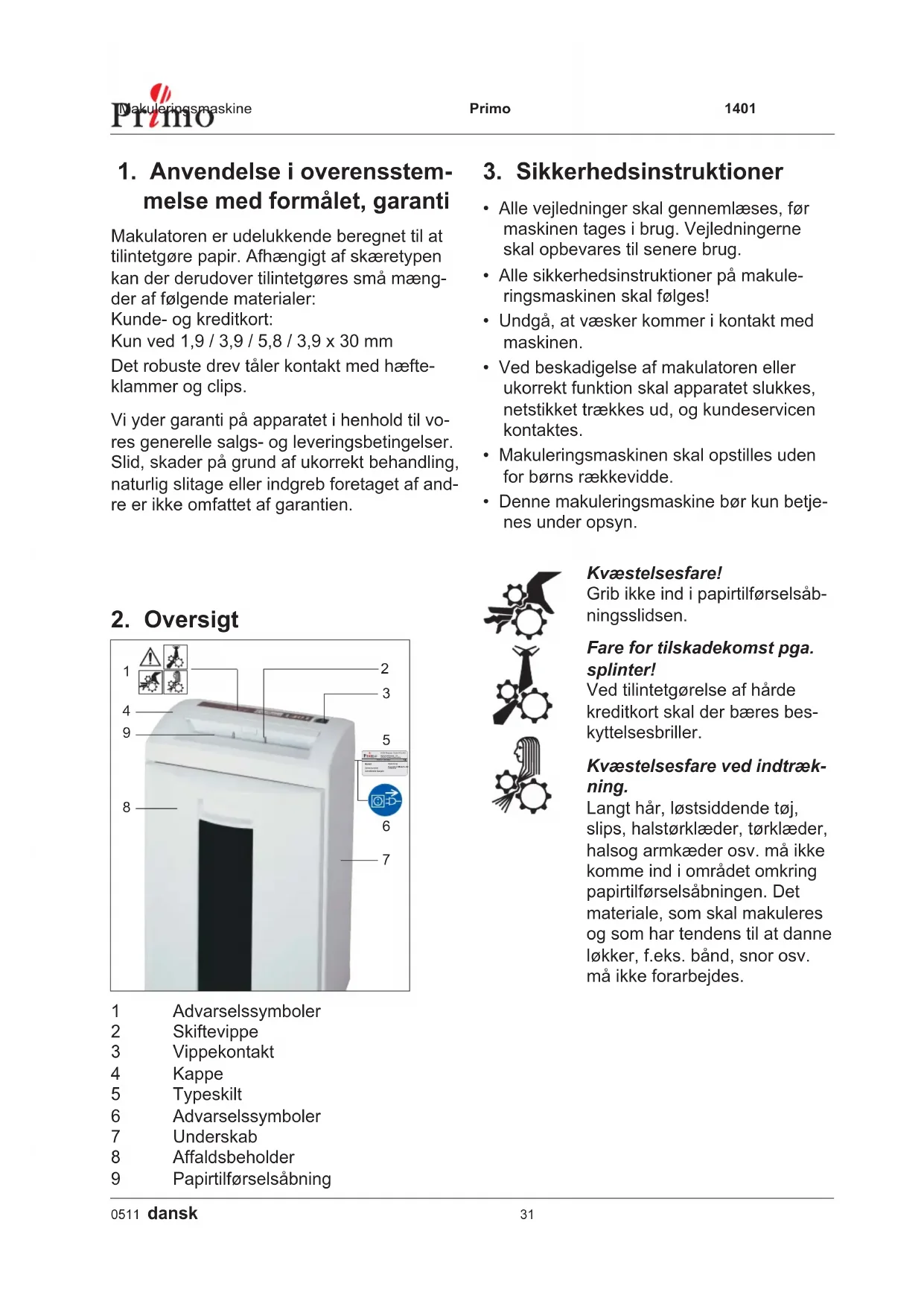 - Denne makuleringsmaskine bør kun betje- nes under opsyn. Kvæstelsesfare! Grib ikke ind i papirtilførselsåb- ningsslidsen. Fare for tilskadekomst pga. splinter! Ved tilintetgørelse af hårde kreditkort skal der bæres bes- kyttelsesbriller. Kvæstelsesfare ved indtræk- ning. Langt hår, løstsiddende tøj, slips, halstørklæder, tørklæder, halsog armkæder osv. må ikke komme ind i området omkring papirtilførselsåbningen. Det materiale, som skal makuleres og som har tendens til at danne løkker, f.eks. bånd, snor osv. må ikke forarbejdes.