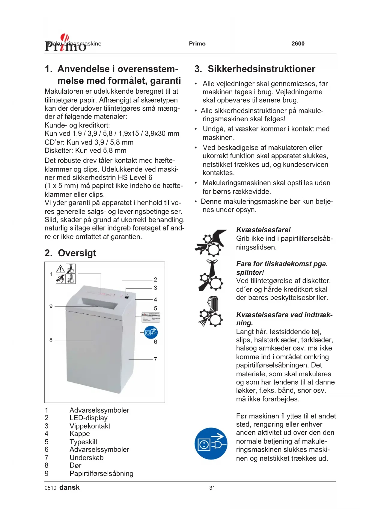 CD’er: Kun ved 3,9 / 5,8 mm Disketter: Kun ved 5,8 mm Det robuste drev tåler kontakt med hæfte- klammer og clips. Udelukkende ved maski- ner med sikkerhedstrin HS Level 6 (1 x 5 mm) må papiret ikke indeholde hæfte- klammer eller clips. Vi yder garanti på apparatet i henhold til vo- res generelle salgs- og leveringsbetingelser. Slid, skader på grund af ukorrekt behandling, naturlig slitage eller indgreb foretaget af and- re er ikke omfattet af garantien.Primo 2600 Makuleringsmaskine 32 dansk 0510