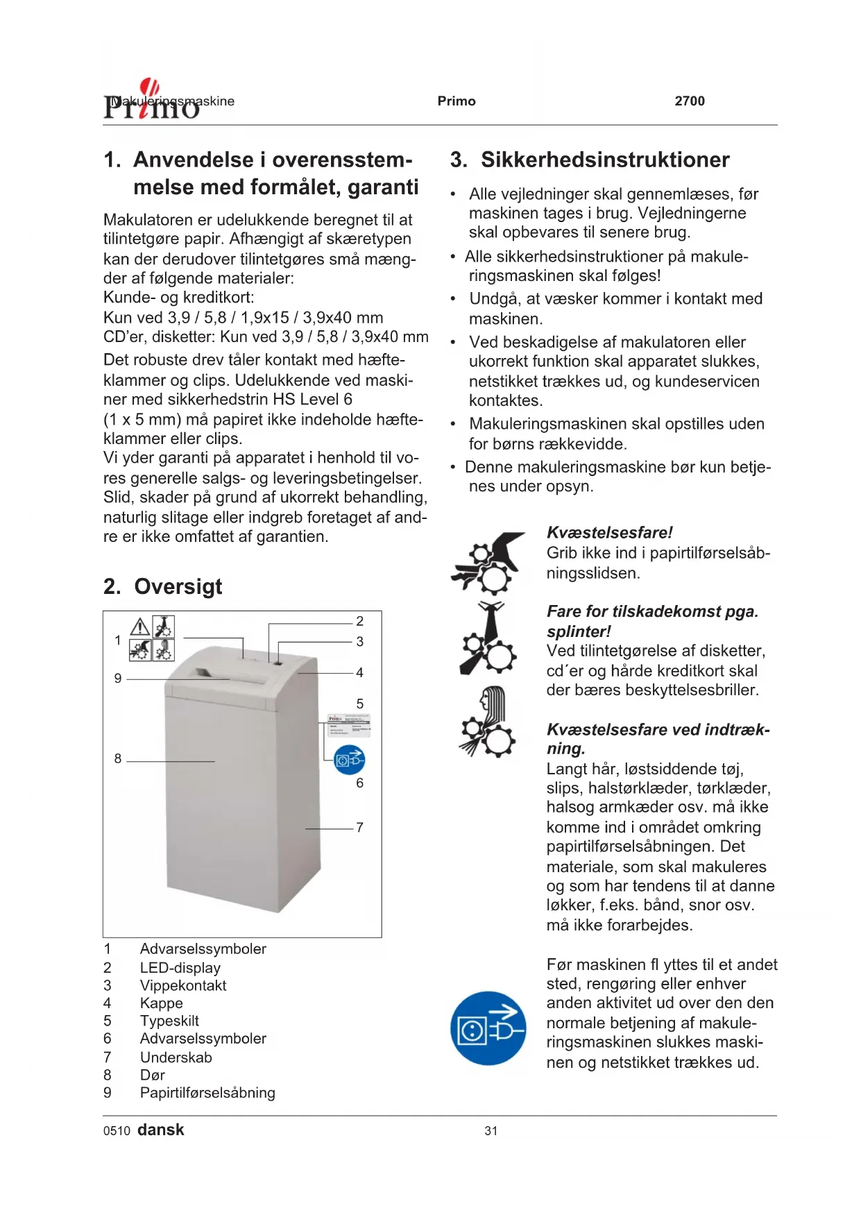 - Kontrollér, før netstikket sættes i, at strøm- nettes spænding og frekvens stemmer overens med angivelserne på typeskiltet. Før ibrugtagning: Fingerskruerne på transportsikringen skrues ud. 2Makuleringsmaskine Primo 2700 0510 dansk 33 Dørkontakt afbrudt
