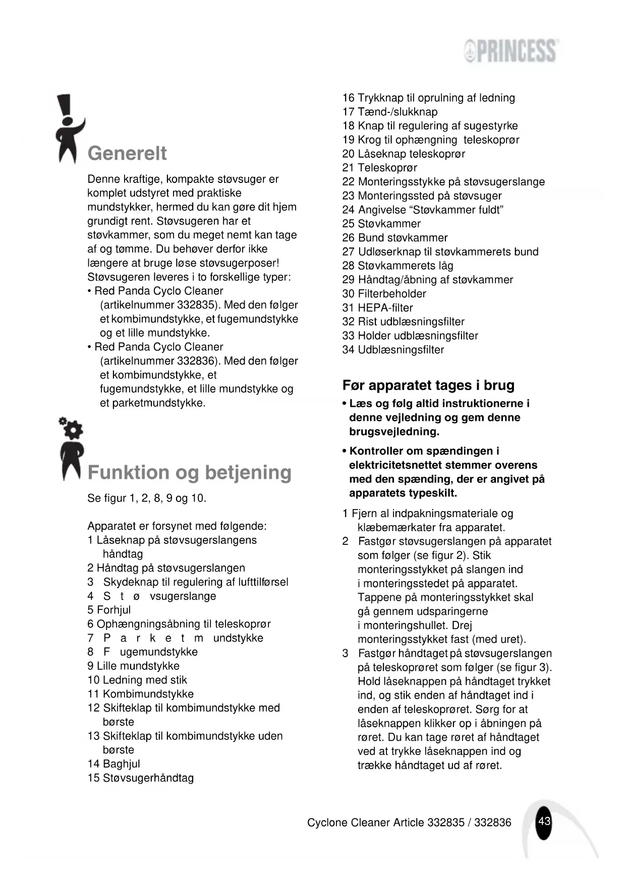 - Red Panda Cyclo Cleaner (artikelnummer 332836). Med den følger et kombimundstykke, et fugemundstykke, et lille mundstykke og et parketmundstykke. Funktion og betjening Se figur 1, 2, 8, 9 og 10. Apparatet er forsynet med følgende: 1 Låseknap på støvsugerslangens håndtag 2 Håndtag på støvsugerslangen 3 Skydeknap til regulering af lufttilførsel 4Støvsugerslange 5 Forhjul 6 Ophængningsåbning til teleskoprør 7Parketmundstykke 8Fugemundstykke 9 Lille mundstykke 10 Ledning med stik 11 Kombimundstykke 12 Skifteklap til kombimundstykke med børste 13 Skifteklap til kombimundstykke uden børste 14 Baghjul 15 Støvsugerhåndtag 16 Trykknap til oprulning af ledning 17 Tænd-/slukknap 18 Knap til regulering af sugestyrke 19 Krog til ophængning teleskoprør 20 Låseknap teleskoprør 21 Teleskoprør 22 Monteringsstykke på støvsugerslange 23 Monteringssted på støvsuger 24 Angivelse “Støvkammer fu ldt” 25 Støvkammer 26 Bund støvkammer 27 Udløserknap til støvkammerets bund 28 Støvkammerets låg 29 Håndtag/åbning af støvkammer 30 Filterbeholder 31 HEPA-filter 32 Rist udblæsningsfilter 33 Holder udblæsningsfilter 34 Udblæsningsfilter Før apparatet tages i brug