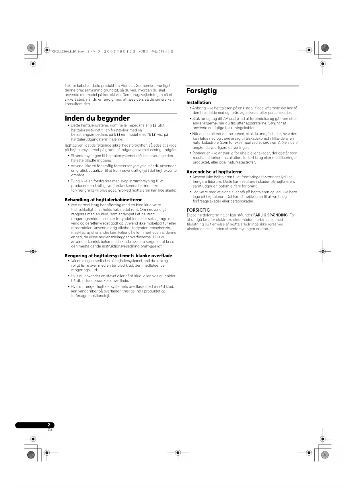 Da Tak for købet af dette produkt fra Pioneer. Gennemlæs venligst denne brugsanvisning grundigt, så du ved, hvordan du skal anvende din model på korrekt vis. Gem brugsvejledningen på et sikkert sted, når du er færdig med at læse den, så du senere kan konsultere den. Inden du begynder • Dette højttalersystems nominelle impedans er 6 Ω. Slut højttalersystemet til en forstærker med en belastningsimpedans på 6 Ω (en model med “6 Ω” vist på højttalerudgangsterminalerne).Iagttag venligst de følgende sikkerhedsforskrifter, således at skade på højttalersystemet på grund af indgangsoverbelastning undgås:• Strømforsyningen til højttalersystemet må ikke overstige den højeste tilladte indgang.• Anvend ikke en for kraftig forstærkerlydstyrke, når du anvender en grafisk equalizer til at fremhæve kraftig lyd i det højfrekvente område.• Tving ikke en forstærker med svag strømforsyning til at producere en kraftig lyd (forstærkerens harmoniske forvrængning vil blive øget, hvorved højttaleren kan lide skade). Behandling af højttalerkabinetterne • Ved normal brug bør aftørring med en blød klud være tilstrækkeligt til at holde kabinettet rent. Om nødvendigt rengøres med en klud, som er dyppet i et neutralt rengøringsmiddel, som er fortyndet fem eller seks gange med vand og derefter vredet godt op. Anvend ikke møbelpolitur eller rensemidler. Anvend aldrig alkohol, fortynder, rensebenzin, insektspray eller andre kemikalier på eller i nærheden af denne enhed, da disse midler ødelægger overfladerne. Hvis du anvender kemisk behandlede klude, skal du sørge for at læse den medfølgende instruktionsvejledning omhyggeligt. Rengøring af højttalersystemets blanke overflade • Når du rengør overfladen på højttalersystemet, skal du stille og roligt tørre over med en tør blød klud; den medfølgende rengøringsklud.• Hvis du anvender en støvet eller hård klud, eller hvis du gnider hårdt, ridses produktets overflade.• Hvis du rengør højttalersystemets overflade med en våd klud, kan vanddråber på overfladen trænge ind i produktet og forårsage funktionsfejl. Forsigtig