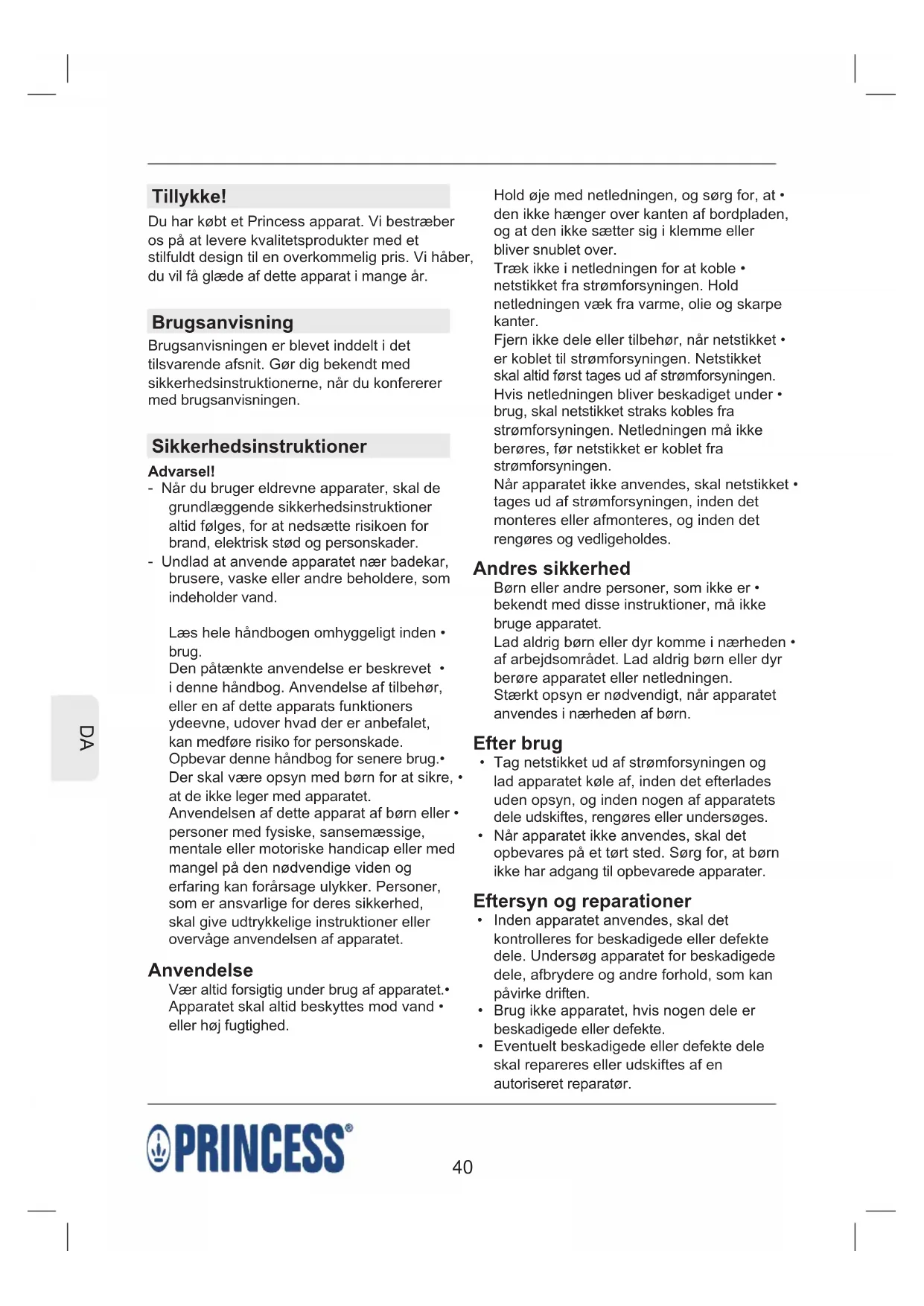 Tillykke! Du har købt et Princess apparat. Vi bestræber os på at levere kvalitetsprodukter med et stilfuldt design til en overkommelig pris. Vi håber, du vil få glæde af dette apparat i mange år. Brugsanvisning Brugsanvisningen er blevet inddelt i det tilsvarende afsnit. Gør dig bekendt med sikkerhedsinstruktionerne, når du konfererer med brugsanvisningen. Sikkerhedsinstruktioner Advarsel! - Når du bruger eldrevne apparater, skal de grundlæggende sikkerhedsinstruktioner altid følges, for at nedsætte risikoen for brand, elektrisk stød og personskader. - Undlad at anvende apparatet nær badekar, brusere, vaske eller andre beholdere, som indeholder vand. Læs hele håndbogen omhyggeligt inden • brug. Den påtænkte anvendelse er beskrevet • i denne håndbog. Anvendelse af tilbehør, eller en af dette apparats funktioners ydeevne, udover hvad der er anbefalet, kan medføre risiko for personskade. Opbevar denne håndbog for senere brug.• Der skal være opsyn med børn for at sikre, • at de ikke leger med apparatet. Anvendelsen af dette apparat af børn eller • personer med fysiske, sansemæssige, mentale eller motoriske handicap eller med mangel på den nødvendige viden og erfaring kan forårsage ulykker. Personer, som er ansvarlige for deres sikkerhed, skal give udtrykkelige instruktioner eller overvåge anvendelsen af apparatet. Anvendelse Vær altid forsigtig under brug af apparatet.• Apparatet skal altid beskyttes mod vand • eller høj fugtighed. Hold øje med netledningen, og sørg for, at • den ikke hænger over kanten af bordpladen, og at den ikke sætter sig i klemme eller bliver snublet over. Træk ikke i netledningen for at koble • netstikket fra strømforsyningen. Hold netledningen væk fra varme, olie og skarpe kanter. Fjern ikke dele eller tilbehør, når netstikket • er koblet til strømforsyningen. Netstikket skal altid først tages ud af strømforsyningen. Hvis netledningen bliver beskadiget under • brug, skal netstikket straks kobles fra strømforsyningen. Netledningen må ikke berøres, før netstikket er koblet fra strømforsyningen. Når apparatet ikke anvendes, skal netstikket • tages ud af strømforsyningen, inden det monteres eller afmonteres, og inden det rengøres og vedligeholdes. Andres sikkerhed Børn eller andre personer, som ikke er • bekendt med disse instruktioner, må ikke bruge apparatet. Lad aldrig børn eller dyr komme i nærheden • af arbejdsområdet. Lad aldrig børn eller dyr berøre apparatet eller netledningen. Stærkt opsyn er nødvendigt, når apparatet anvendes i nærheden af børn. Efter brug Tag netstikket ud af strømforsyningen og • lad apparatet køle af, inden det efterlades uden opsyn, og inden nogen af apparatets dele udskiftes, rengøres eller undersøges. Når apparatet ikke anvendes, skal det • opbevares på et tørt sted. Sørg for, at børn ikke har adgang til opbevarede apparater. Eftersyn og reparationer Inden apparatet anvendes, skal det • kontrolleres for beskadigede eller defekte dele. Undersøg apparatet for beskadigede dele, afbrydere og andre forhold, som kan påvirke driften. Brug ikke apparatet, hvis nogen dele er • beskadigede eller defekte. Eventuelt beskadigede eller defekte dele • skal repareres eller udskiftes af en autoriseret reparatør.41